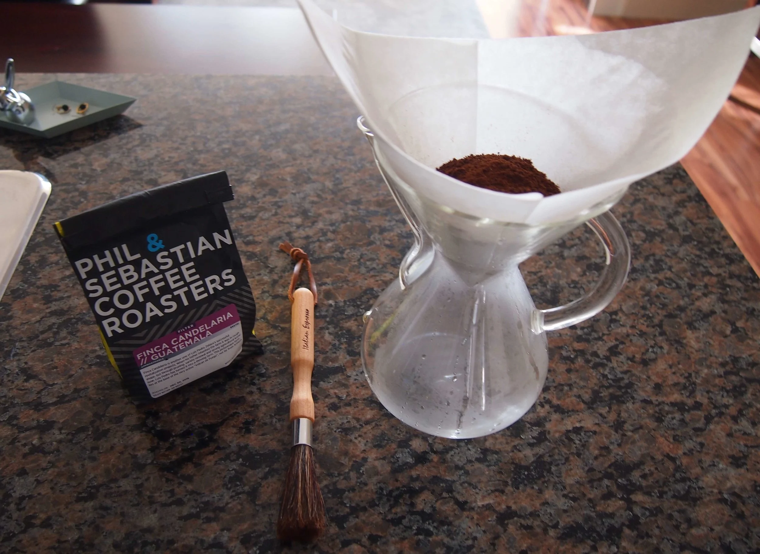 これを使って、ミルについた細かいコーヒーグラインドをペーパーフィルターに入れます。