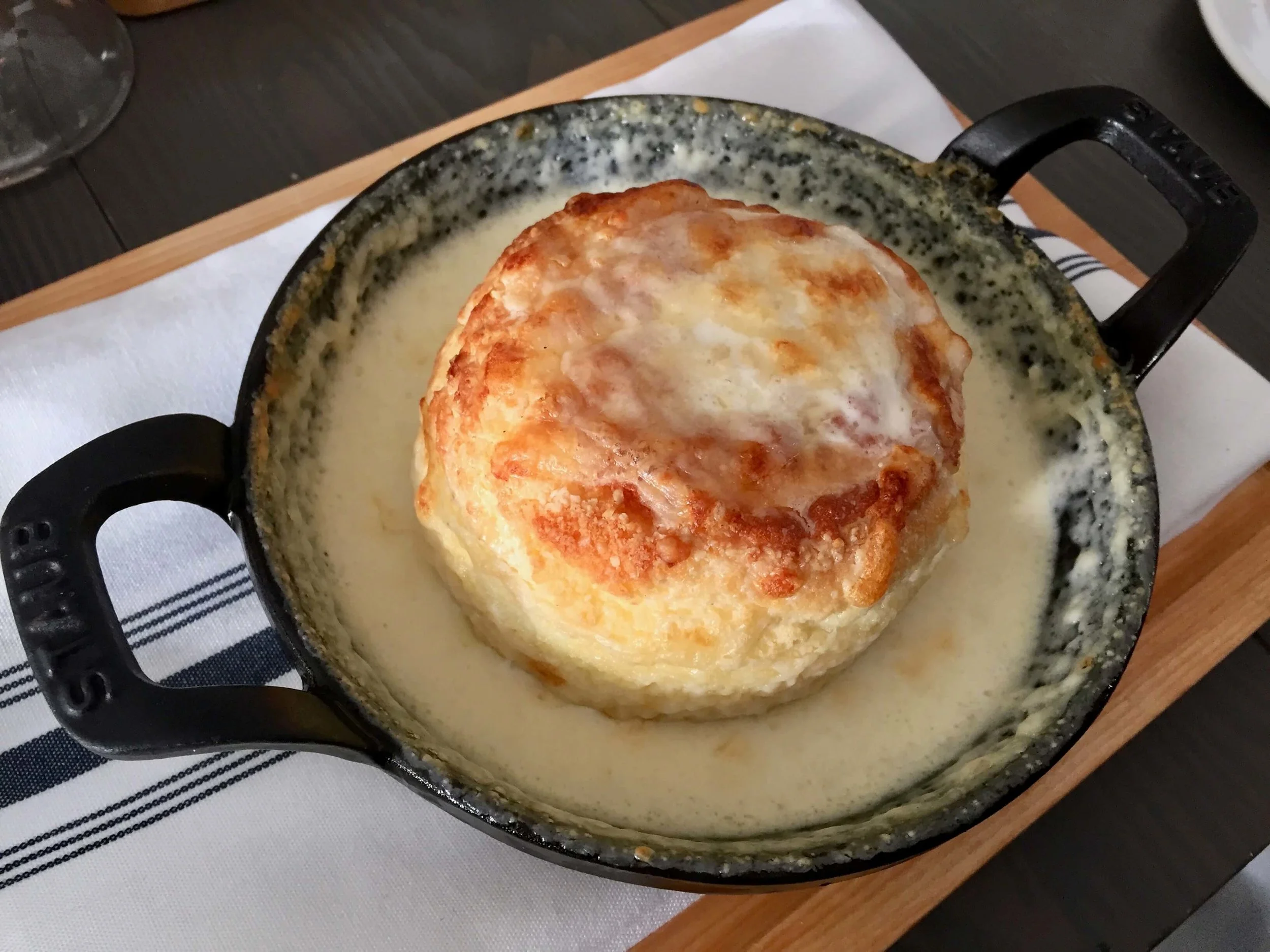 味もさることながら、このスフレが乗っている鉄板がSTAUBだったことに気づく。