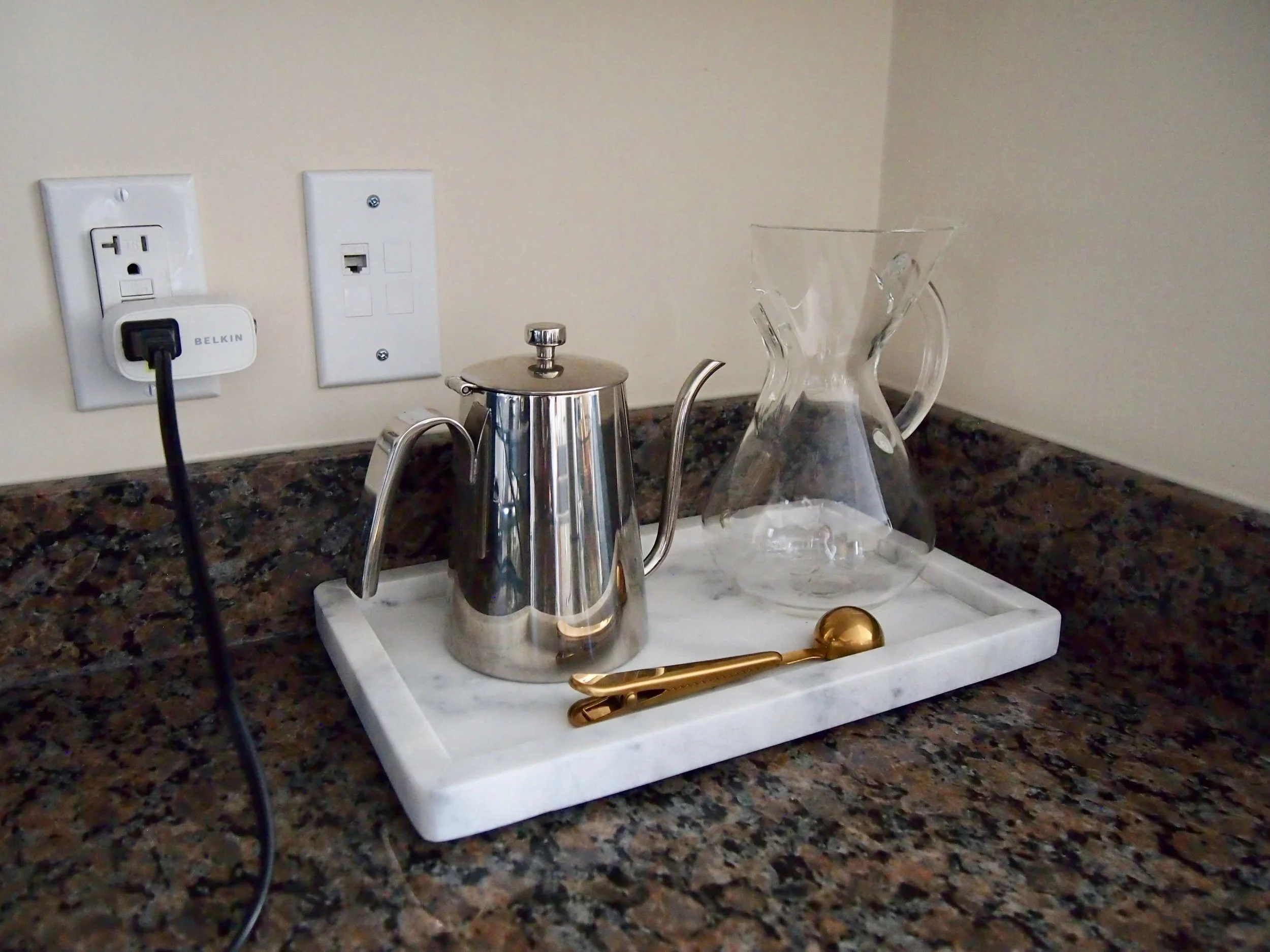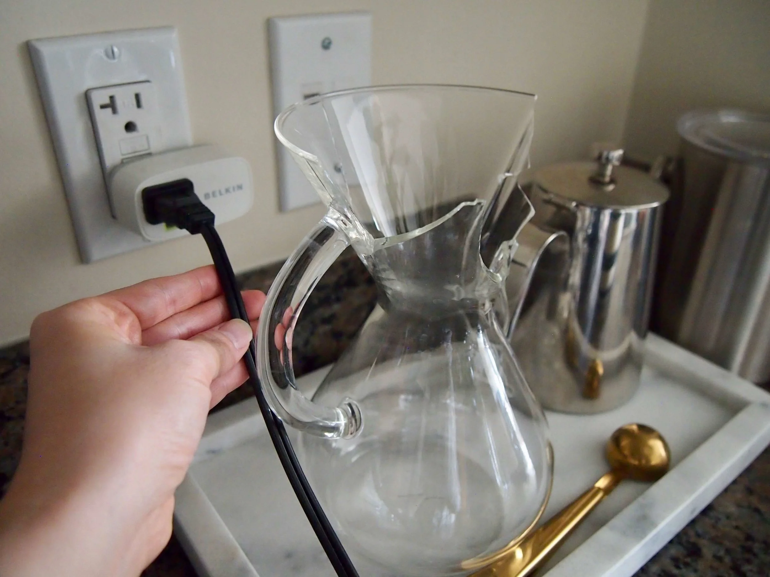 実は、コーヒーメーカーのプラグを差す手前に、ケメックスを置いていました。