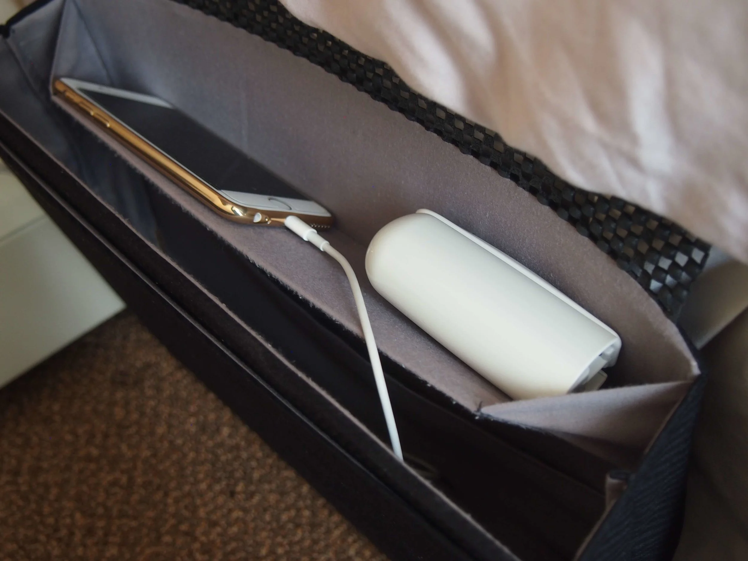 穴があって、携帯の充電器のコードを通し、このボックス内で充電しながら置くことができます。