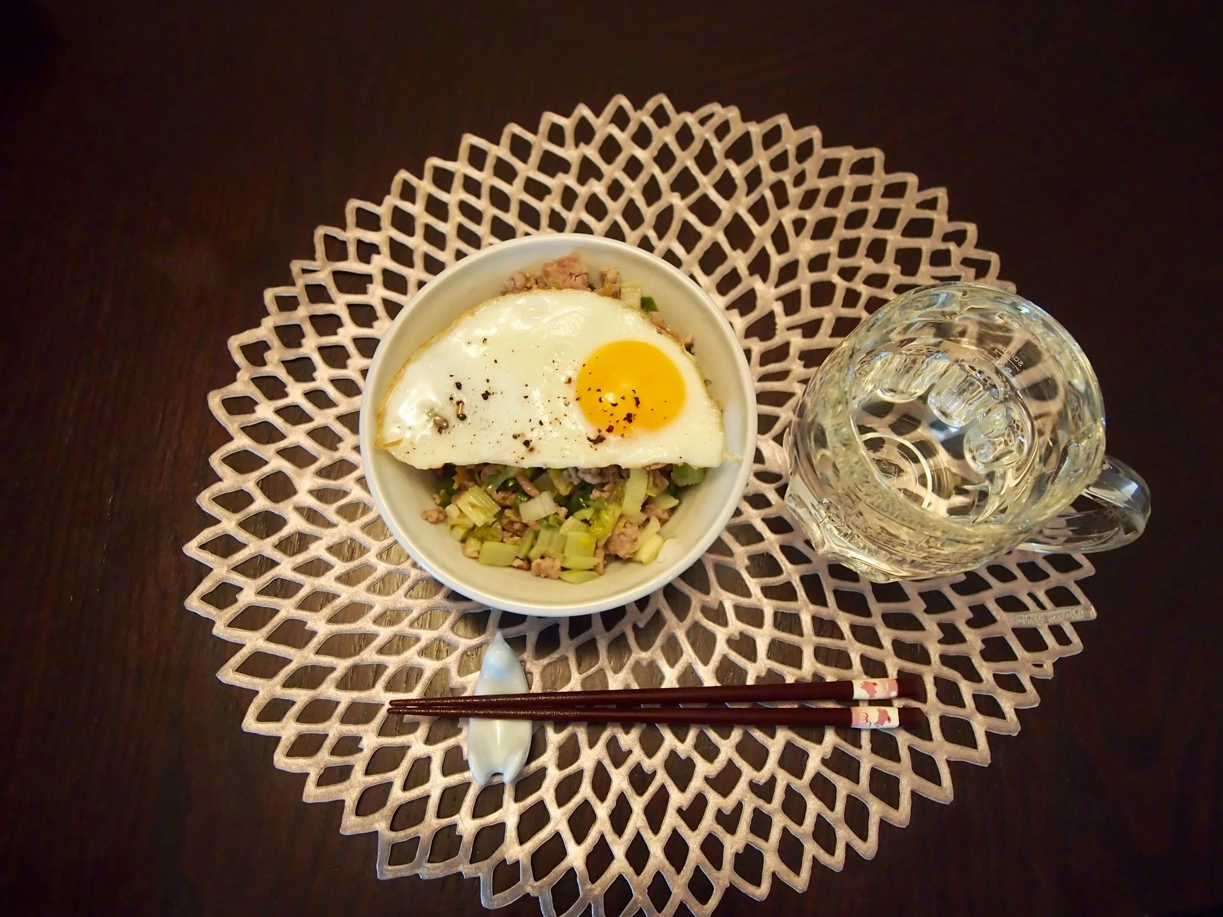 セロリ、ネギを切ってひき肉と炒めただけのシンプル丼。(お見せするほどでもないですね・・・)