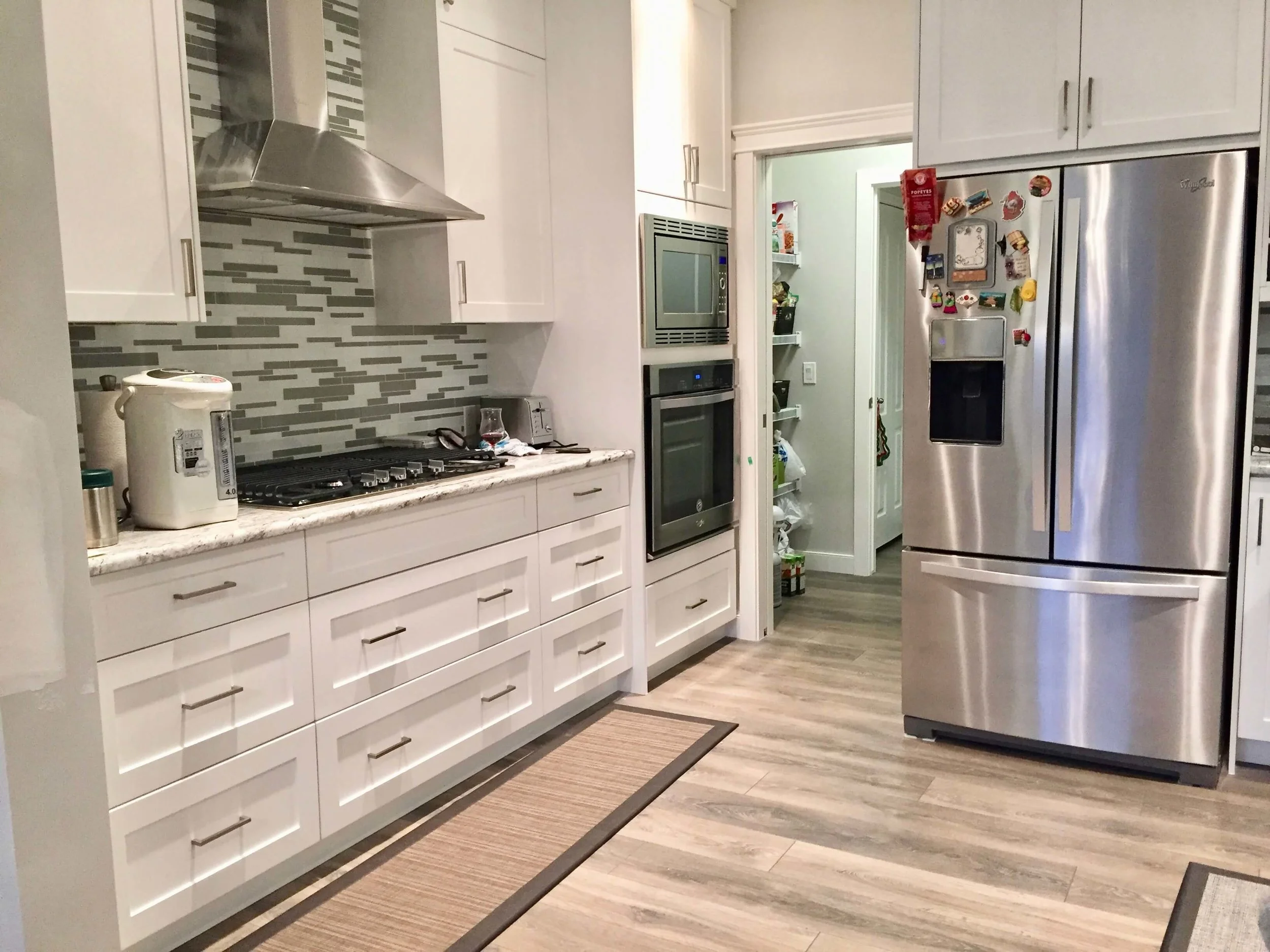 写真に見切れていますが、キッチンコンロや収納棚と並行して、向かいにはキッチンカウンターやシンクがあります。