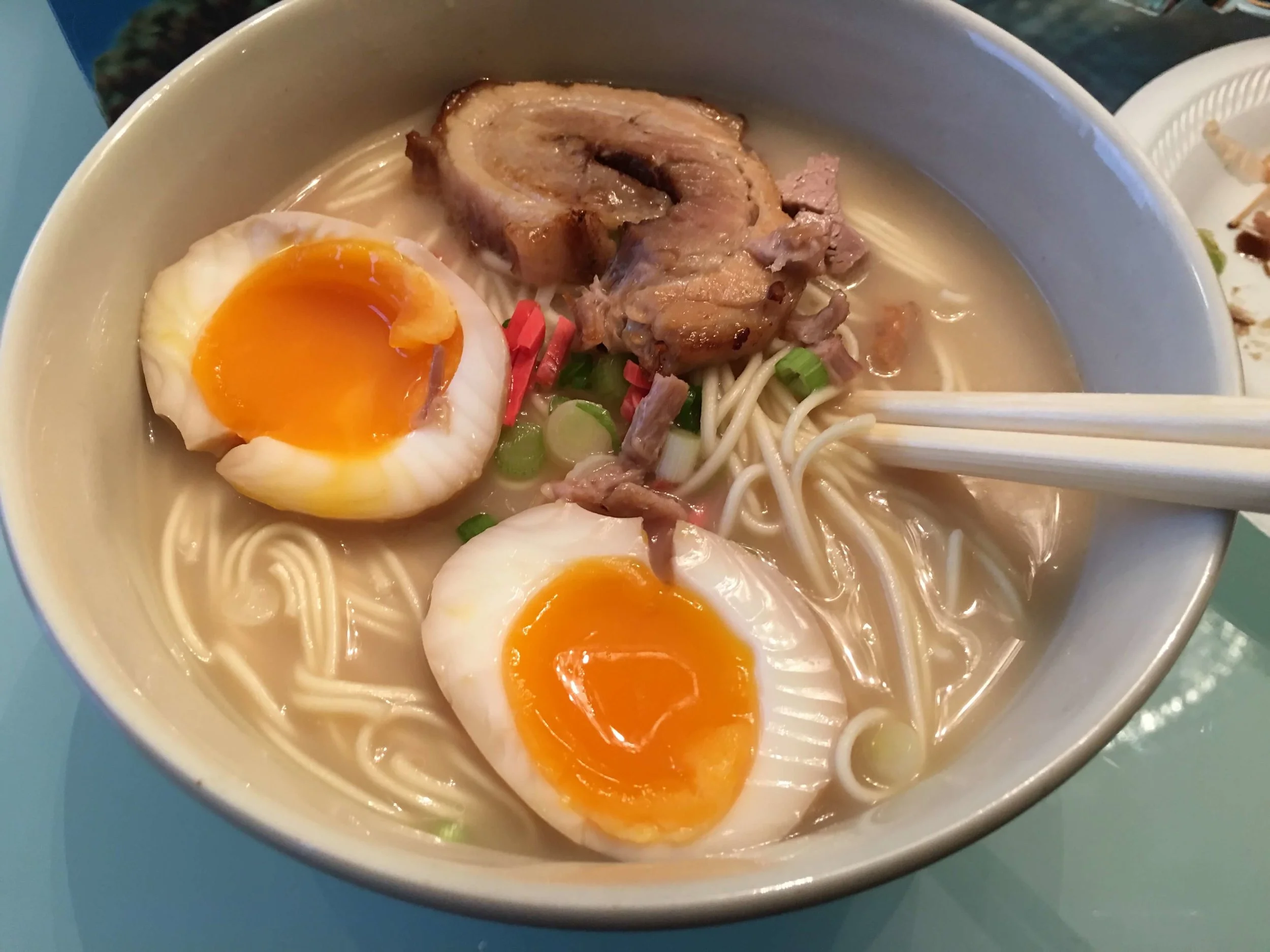 チャーシューは友達の手作りです☆ 卵はこんなに黄身の濃い半熟卵。