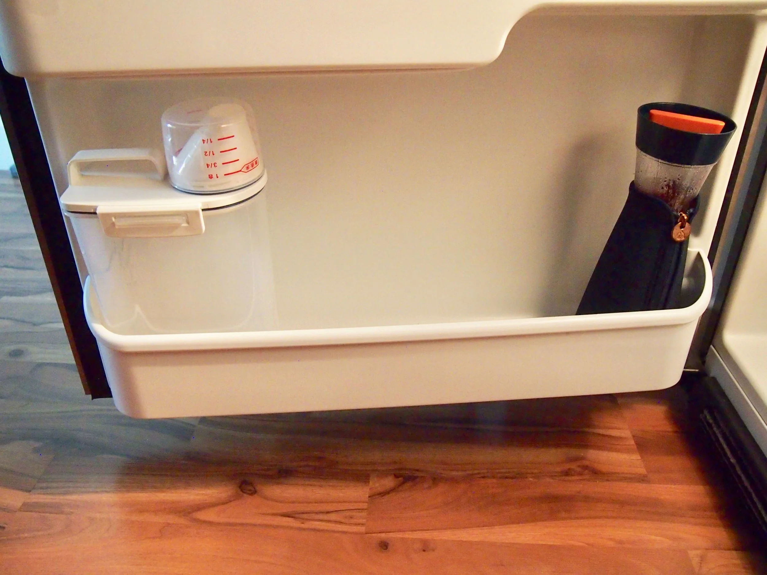 しかもお米が2キロ満タンだとなかなか重いし、我が家の冷蔵庫での入れ方だと側面を掴んで取り出しにくい。