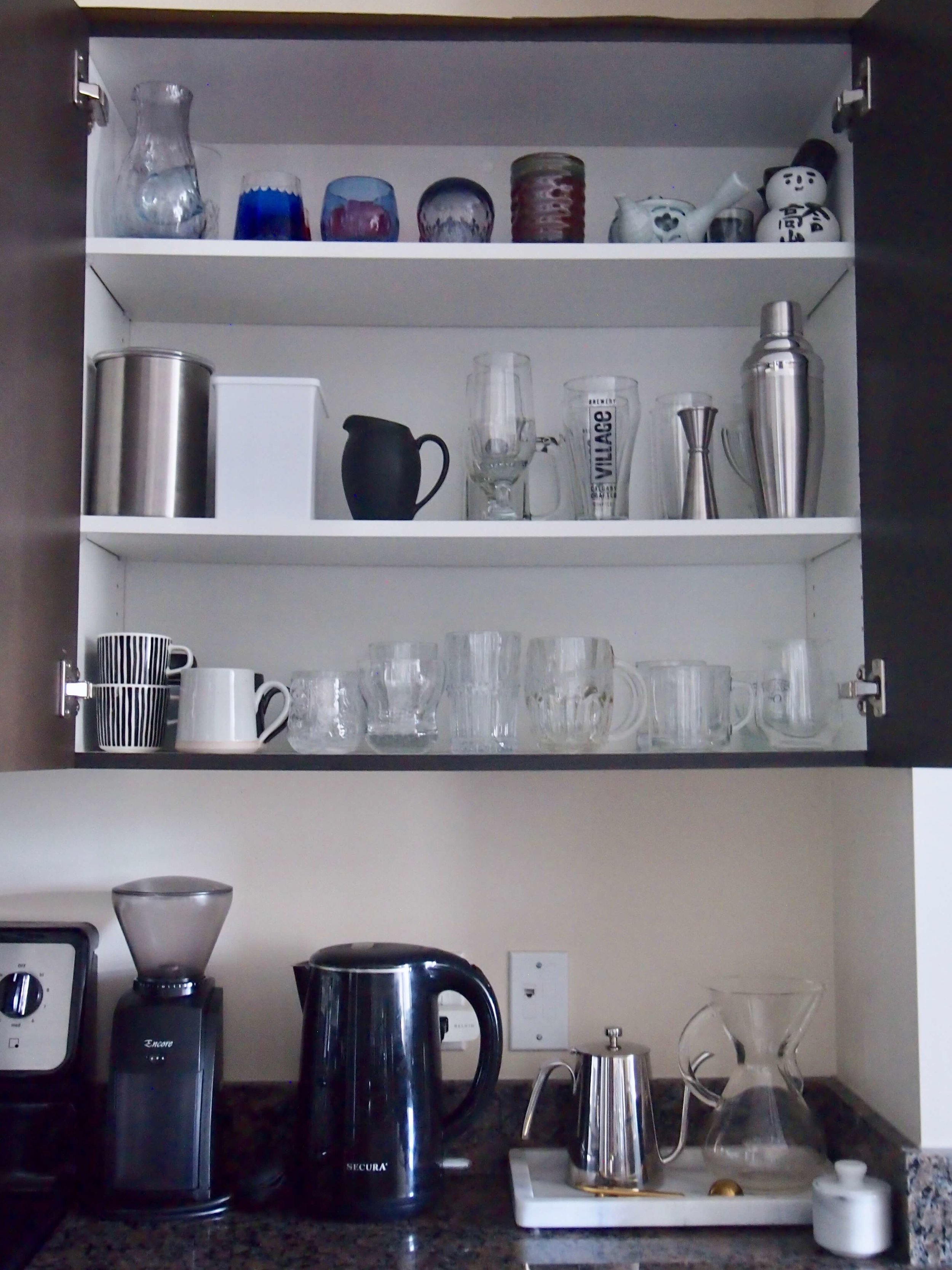 ということで、ケメックスのペーパーフィルターが入ったセリアのDGコンテナをグラスウェアの収納棚に置くことに!(中段左側)