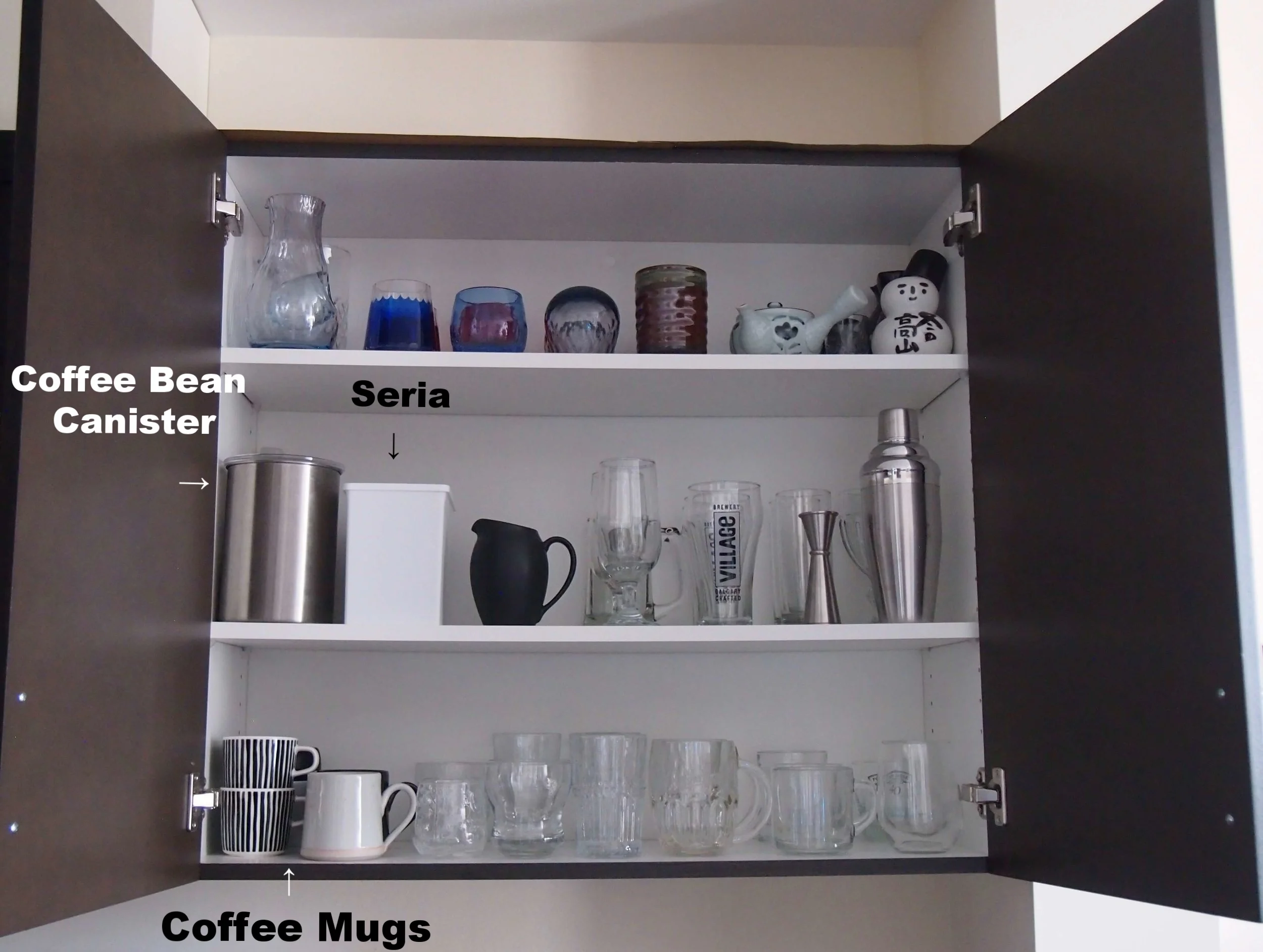 コーヒーはよく飲むため、背の低い私でも使いやすいようにコーヒーグッズ(マグ、コーヒーキャニスター、ペーパーフィルターなど)を全て写真の左側へ寄せています。