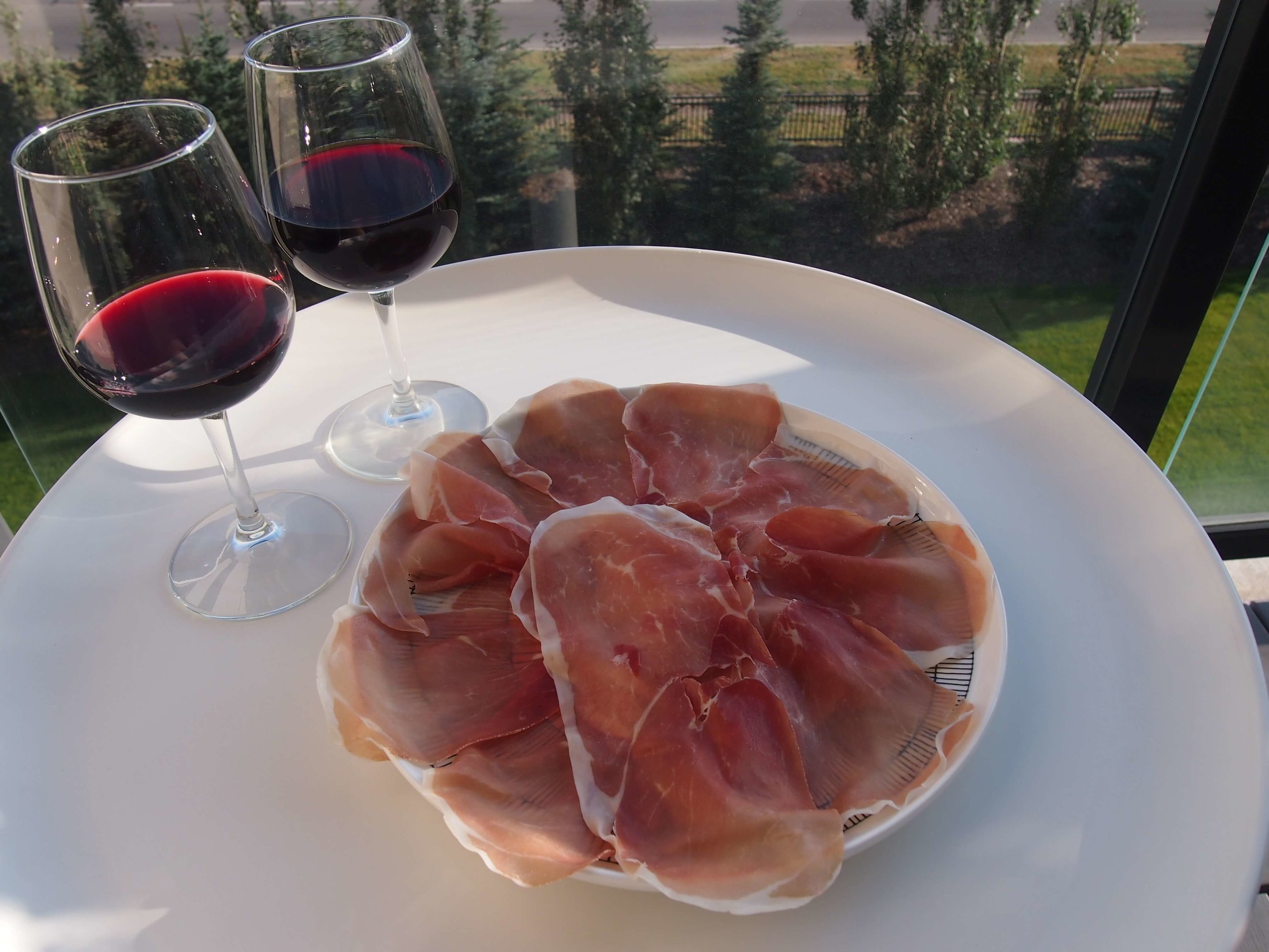 赤ワインと生ハム。(左側のグラスに少ししか入っていないのは ボトルの最後の残りを入れたから)