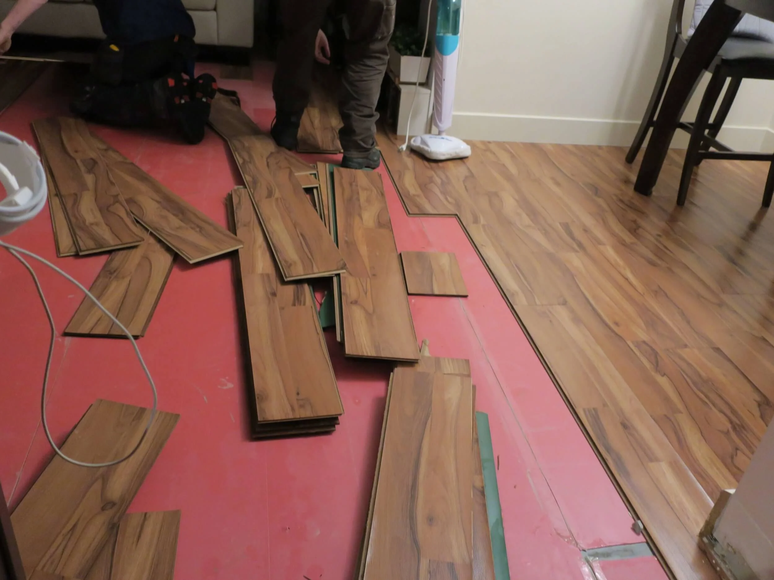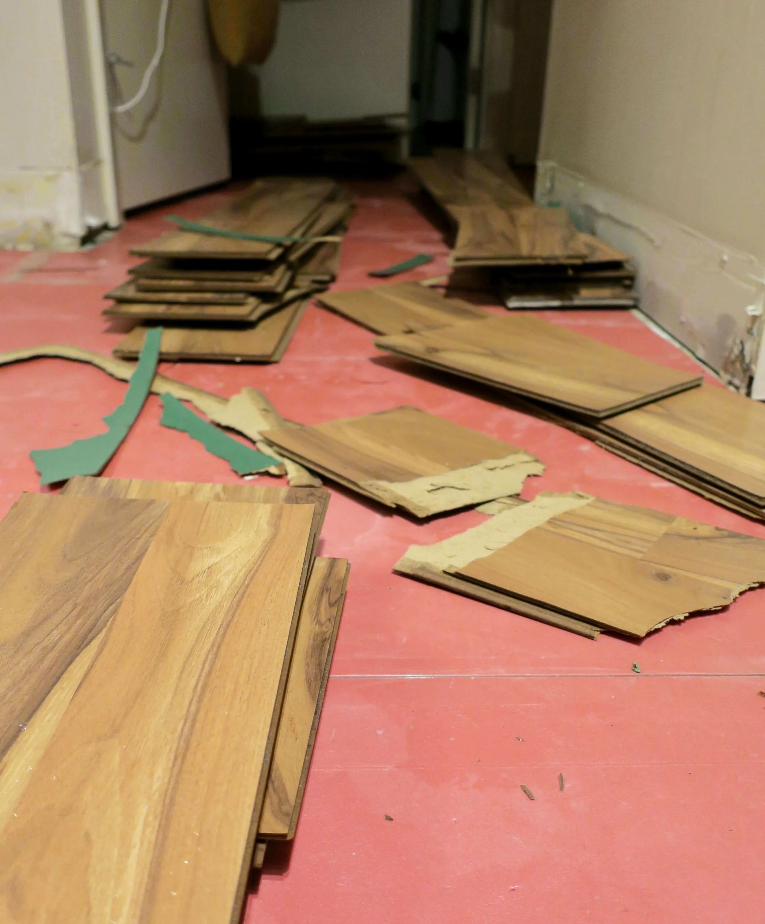 そのうちにバスルーム隣の玄関やキッチンのラミネートフローリングまで全て剥がされまくる。