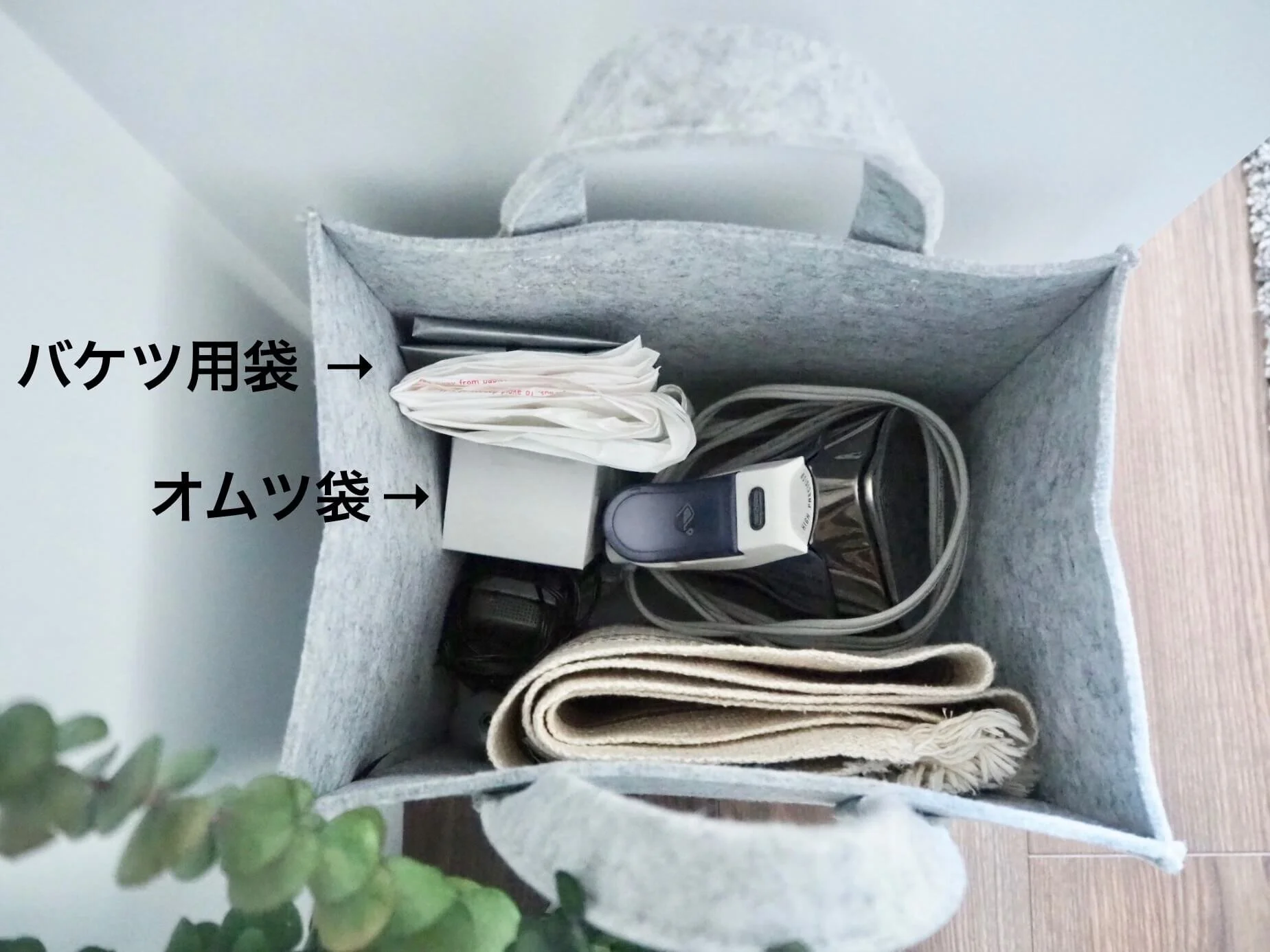 ちなみにオムニウッティバケツの隣にあるイッタラのカバンに臭わない袋やバケツに入れるプラスチックの服を準備。