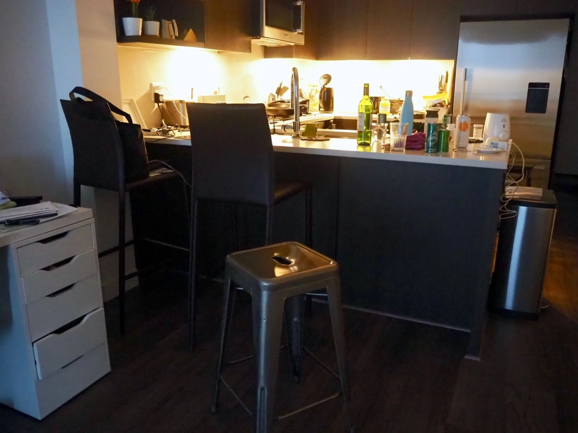 とりあえず必要ないものはキャビネットにしまって キッチンワークトップを水拭きして終了。