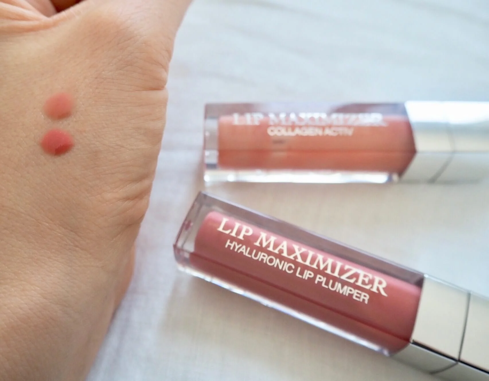 私の手で失敬しますが…グロスをのせてみると上のピンクはほんのり柔らかいピンクって感じですが