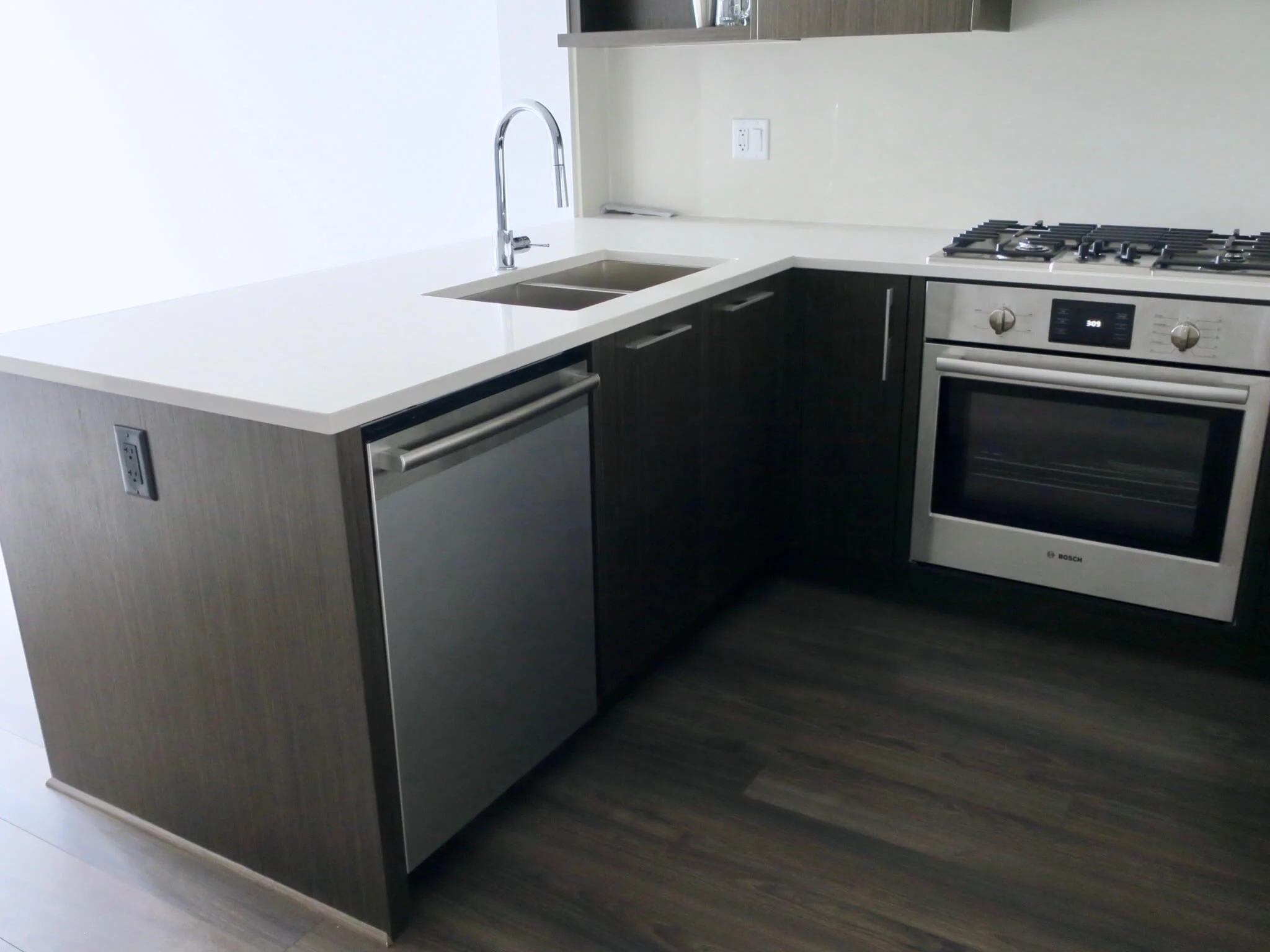 キッチンの側面がワークトップと同じ素材になっているのが嬉しいポイント。