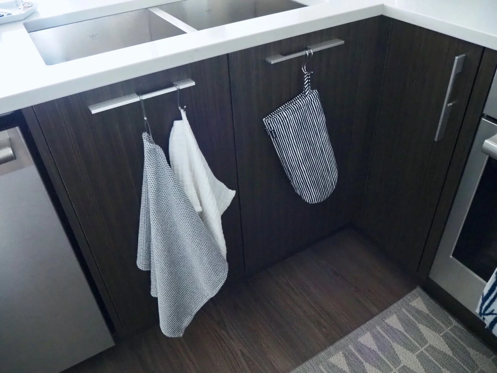 前のマンションで使っていたイケアや無印のフックを使ってティータオルやオーブンミトンをぶら下げています。