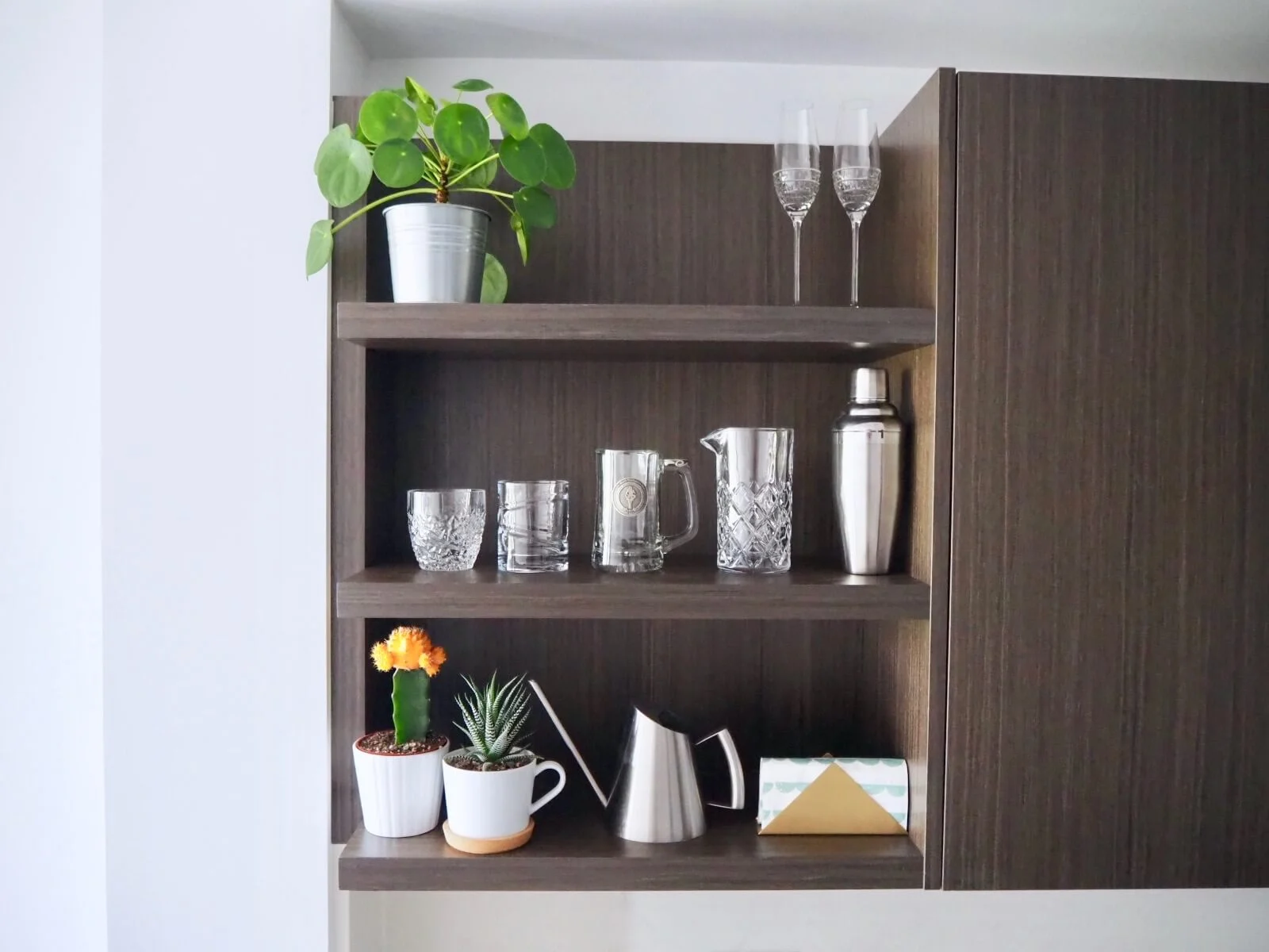 3段目は長くてキャビネットに収まらないシャンパングラスとチャイニーズマニープラント。