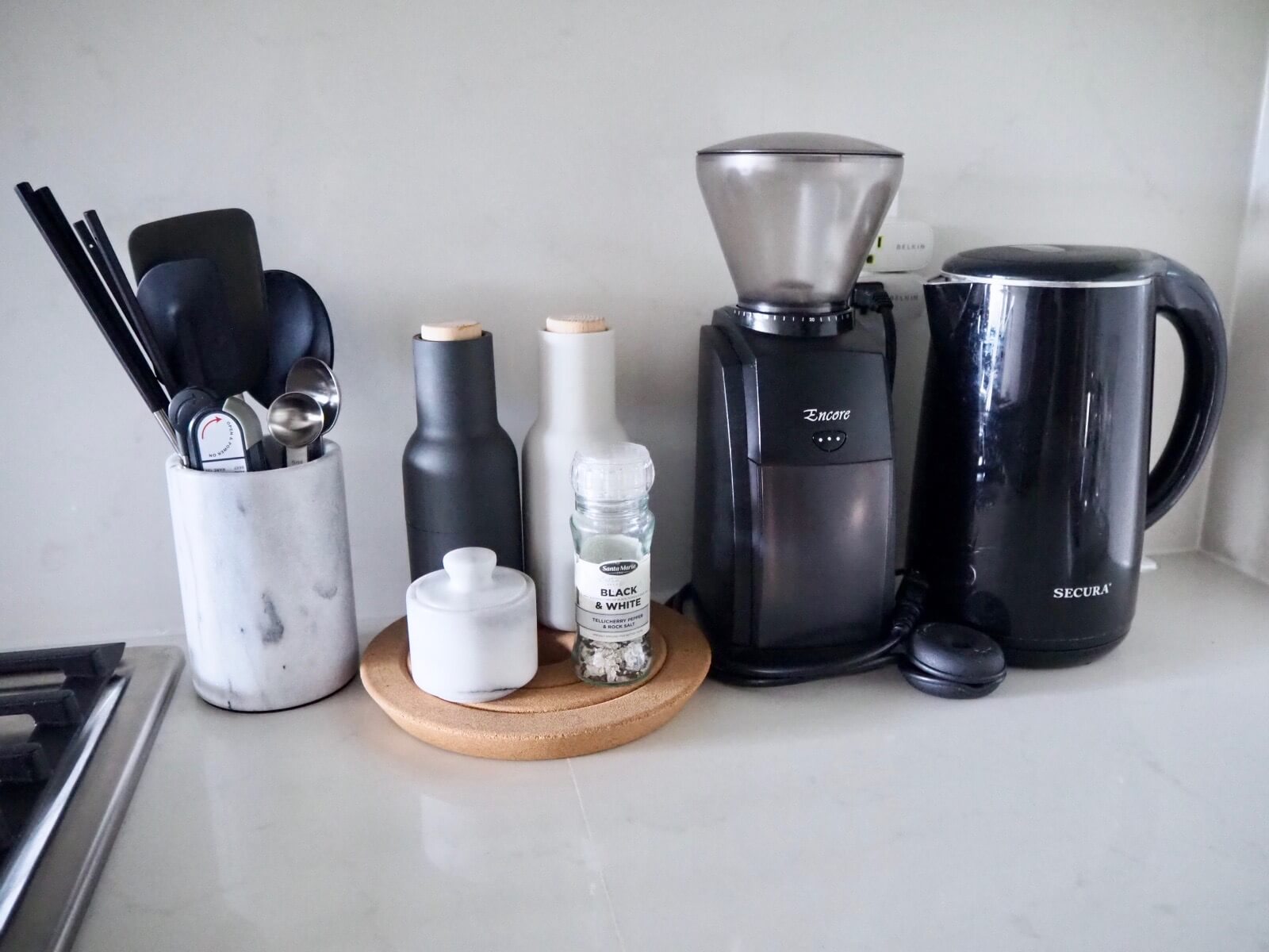 コーヒーグッズは電気ケトルやコーヒーグラインダーの隣に。