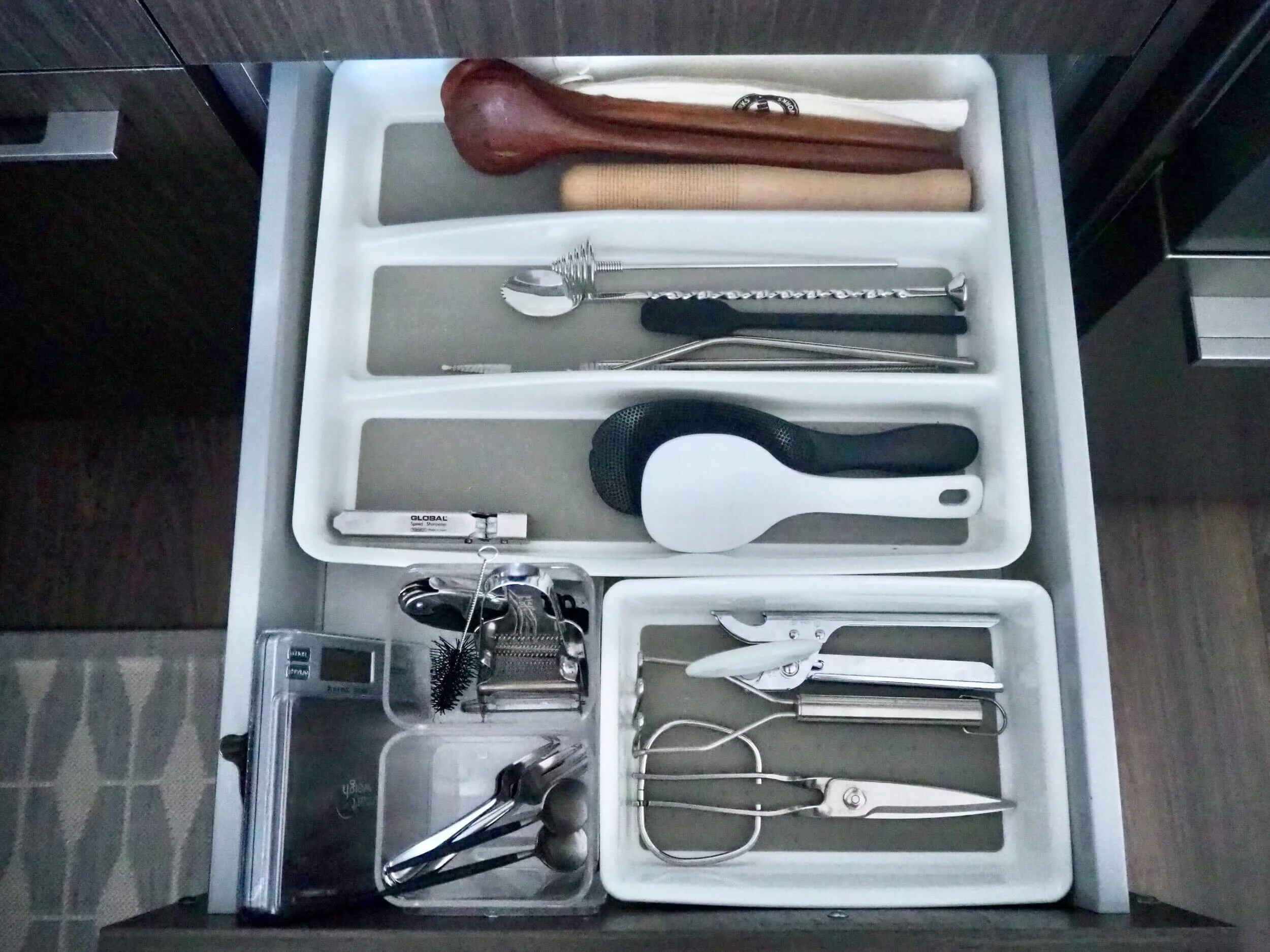 前のマンションのキッチンには2つしか引き出しがなく 良く使うキッチンツールを使いやすい引き出しにギュギュっと集めて収納。