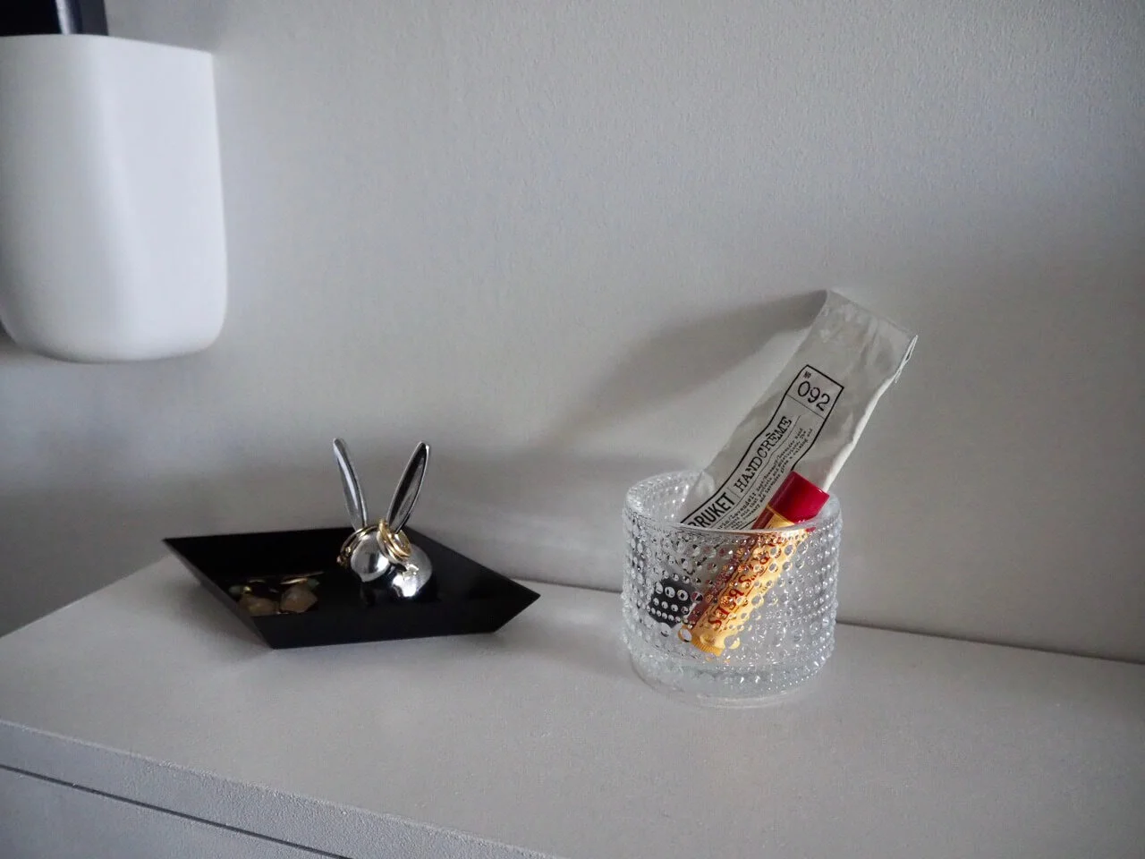 その隣にはイッタラのカステヘルミキャンドルホルダーを小物入れ代わりとして使うことに。