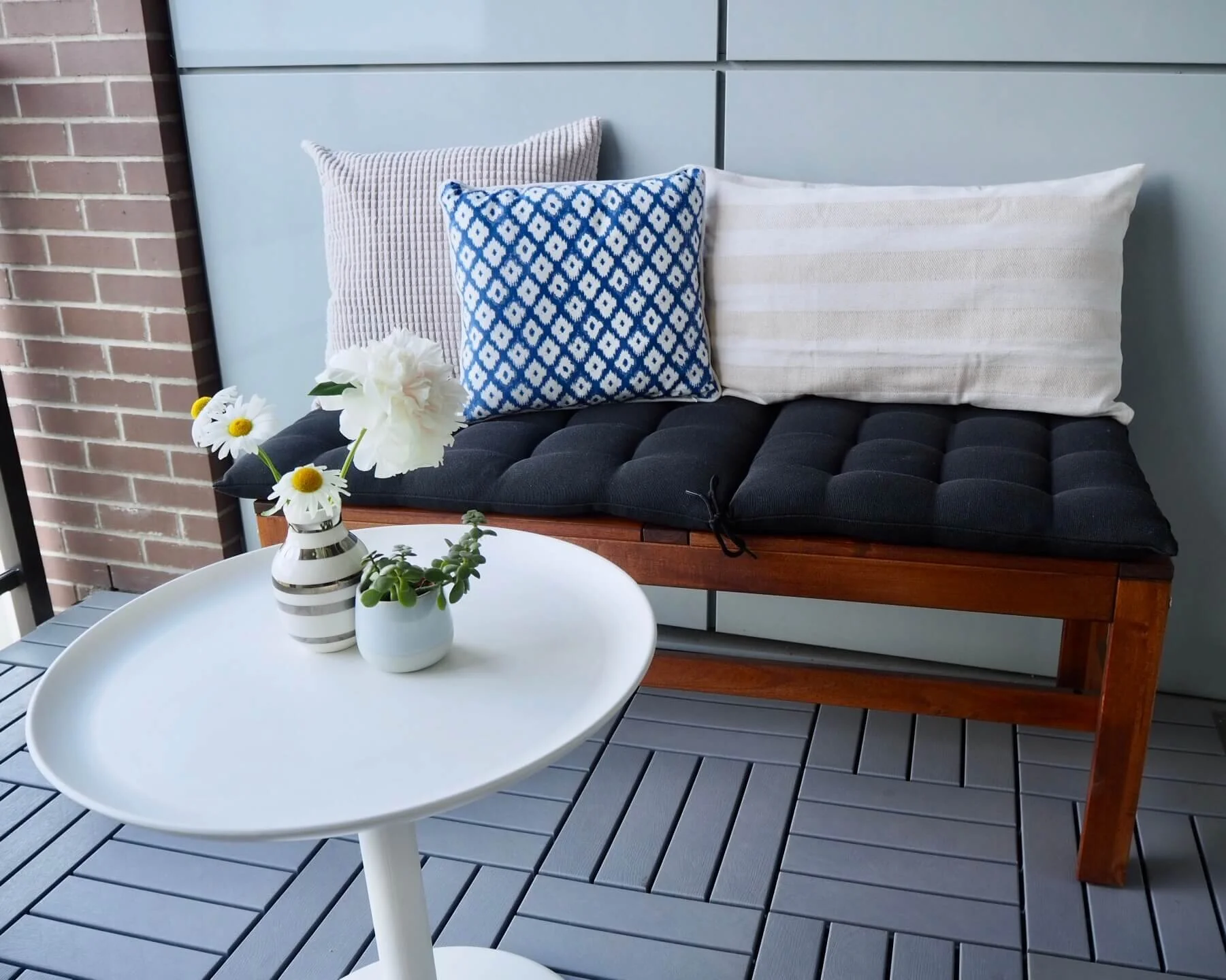 バルコニーのベンチにクッションを並べてみるとこんな感じに。