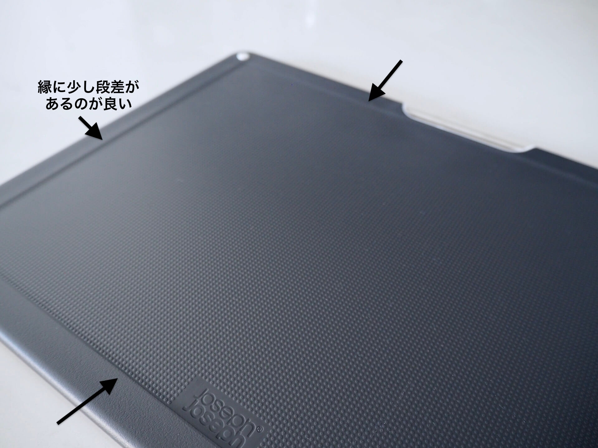 もう1つ嬉しいポイントは縁にわずかに段差があるので カットした食材や水分が散らばりにくく漏れにくいのが良い。