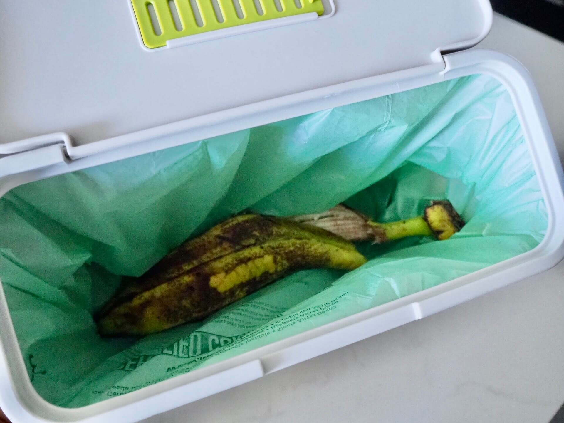 このゴミ箱のサイズ感は大きめのバナナの皮がすっぽり入る。(サイズ:30 x 12 x 17.5 cm)