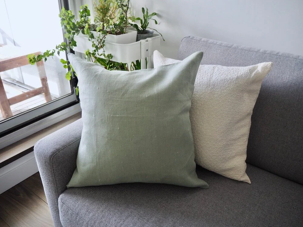 早速 前回買ったオフホワイトのカバーと並べてみるとすっかり春インテリアに。