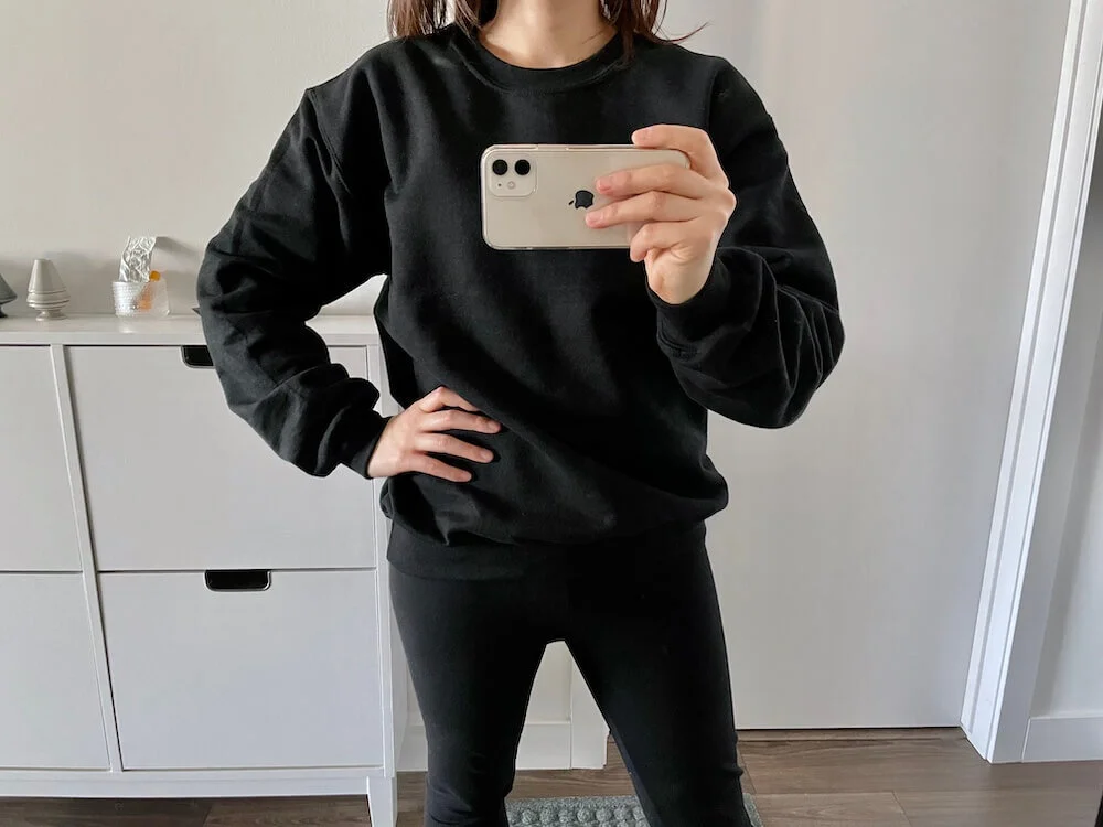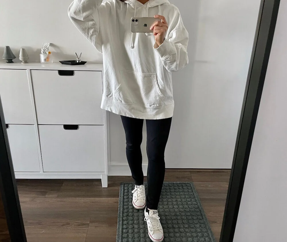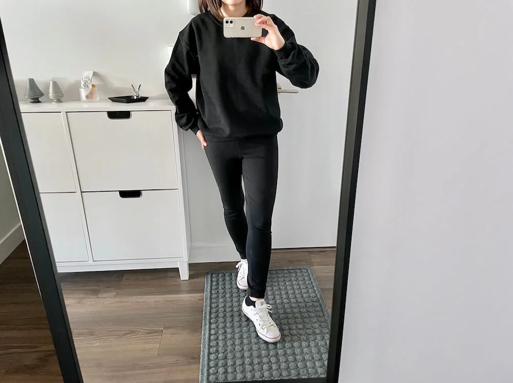 部屋ではスウェットやフディーにレギンススタイルが多い私。