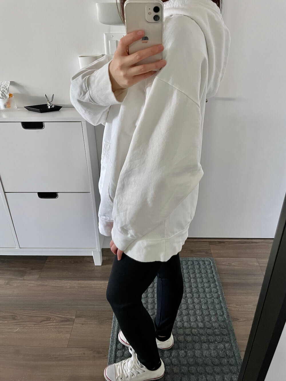 白いフード付きスウェットはうって変わって今時なオーバーサイズ。(これでも一応XS)
