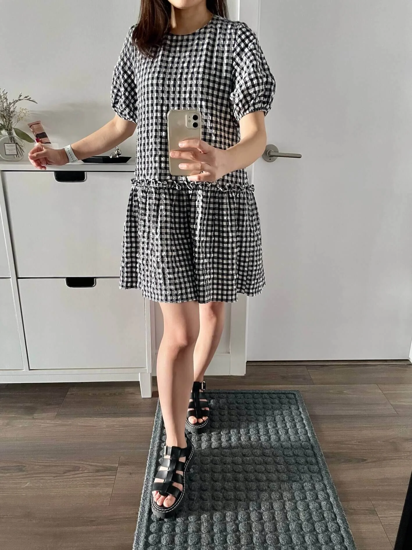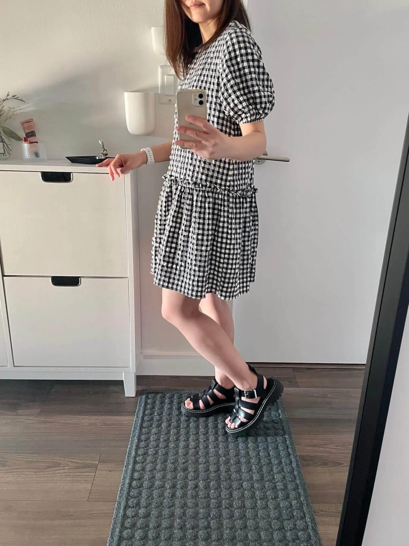 まずは今年のザラセールで買ったギンガムワンピと合わせてみることに。