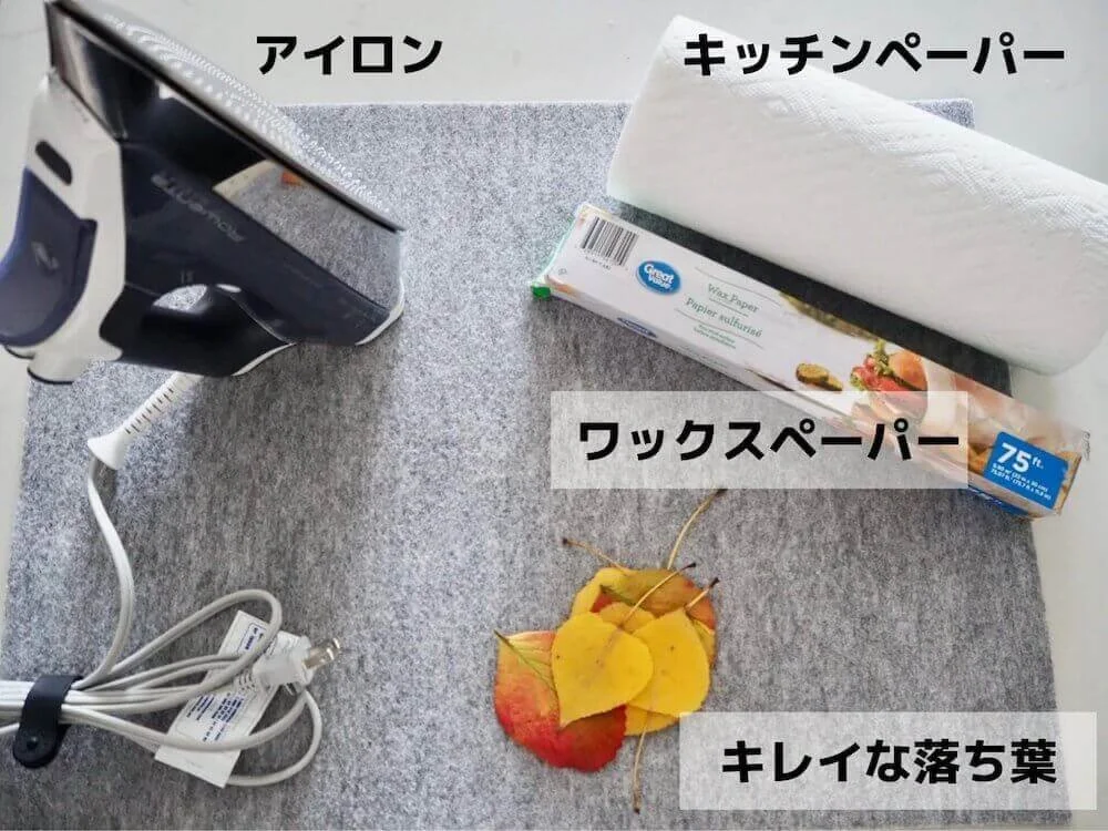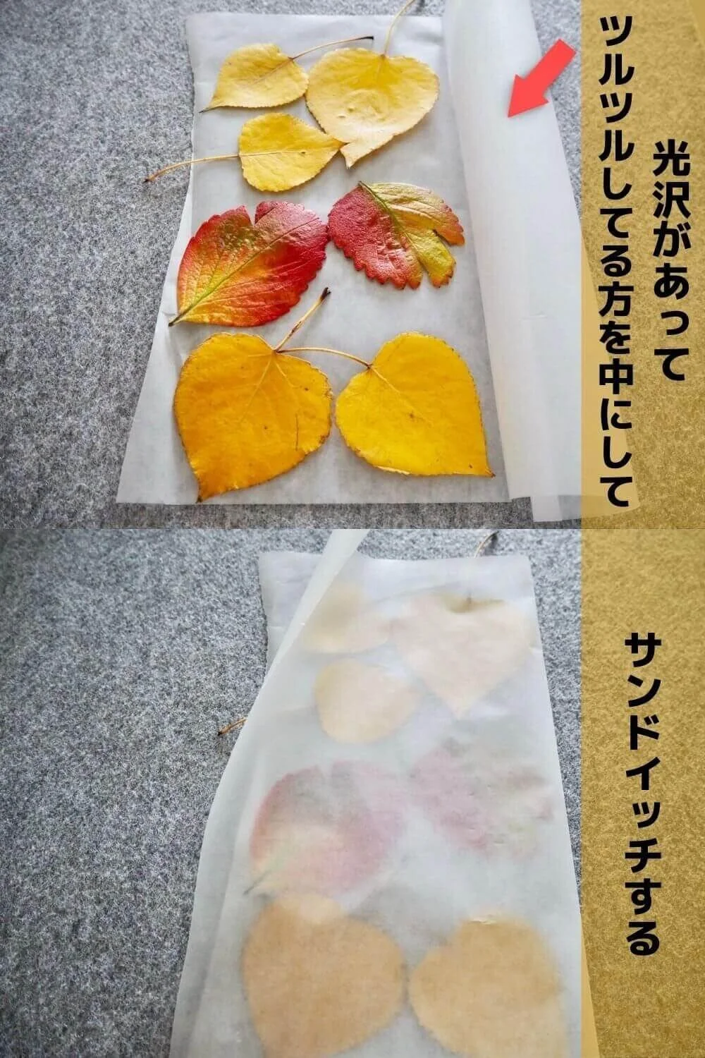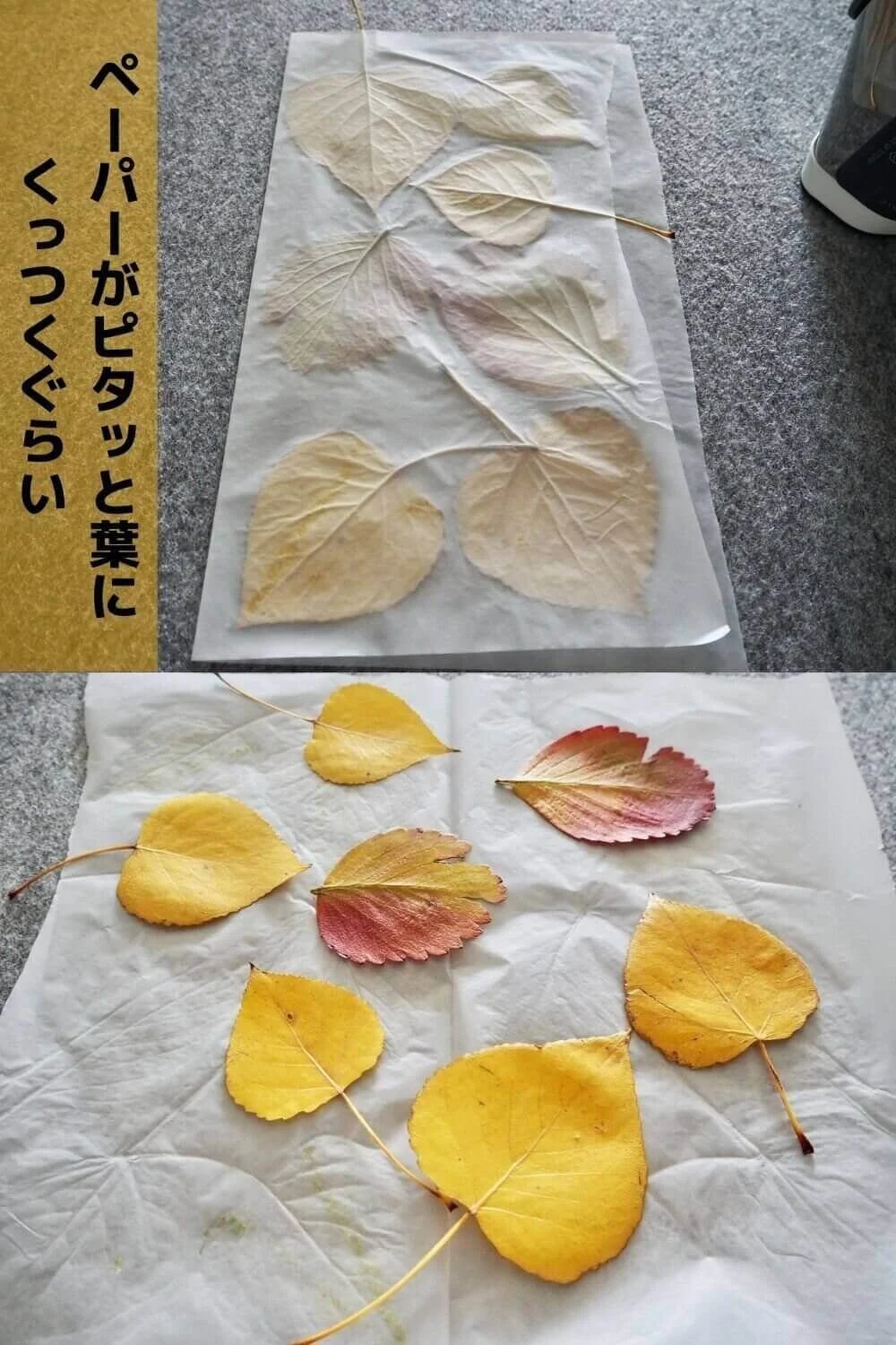 ワックスペーパーで落ち葉を挟んで4~5分アイロン掛け作業