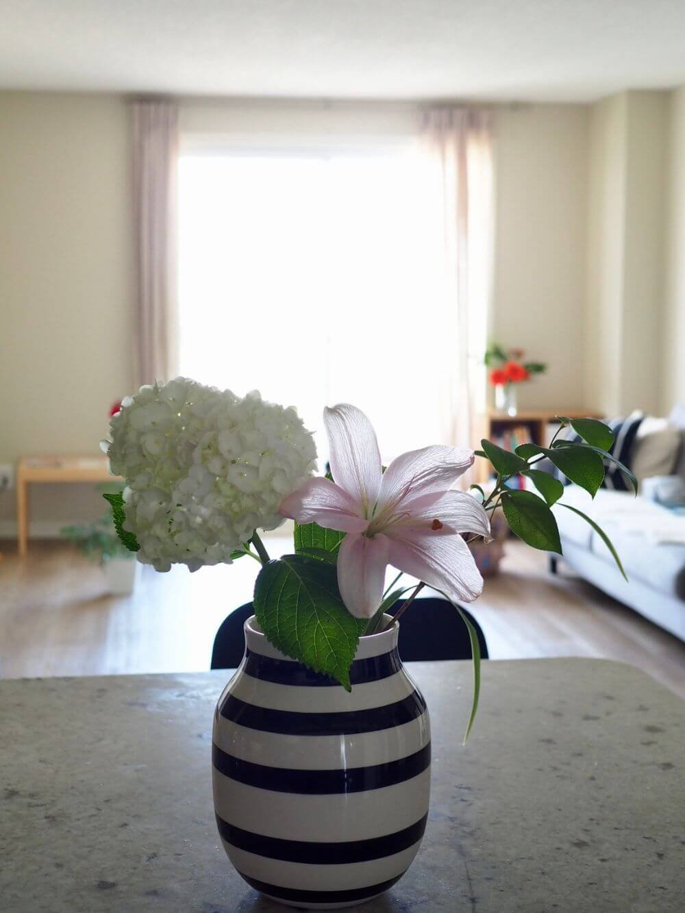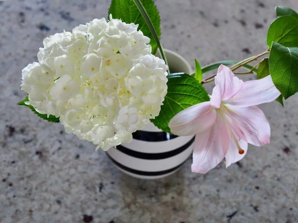 ユリとあじさいはケーラーオマジオのフラワーベースへ(写真右)