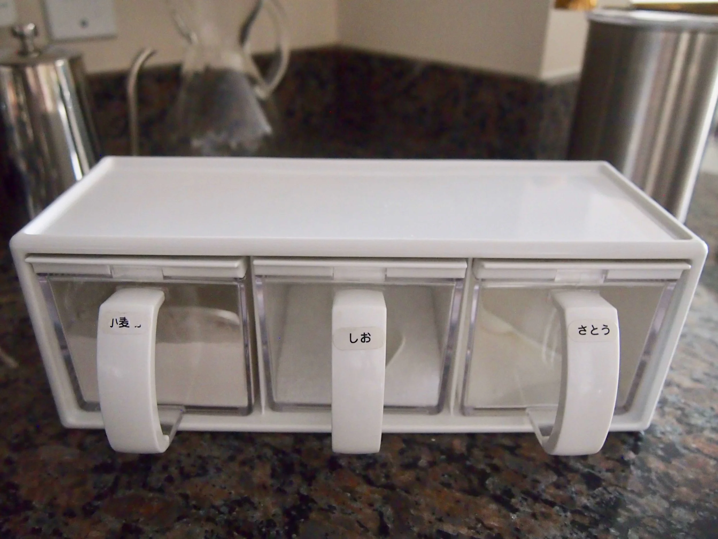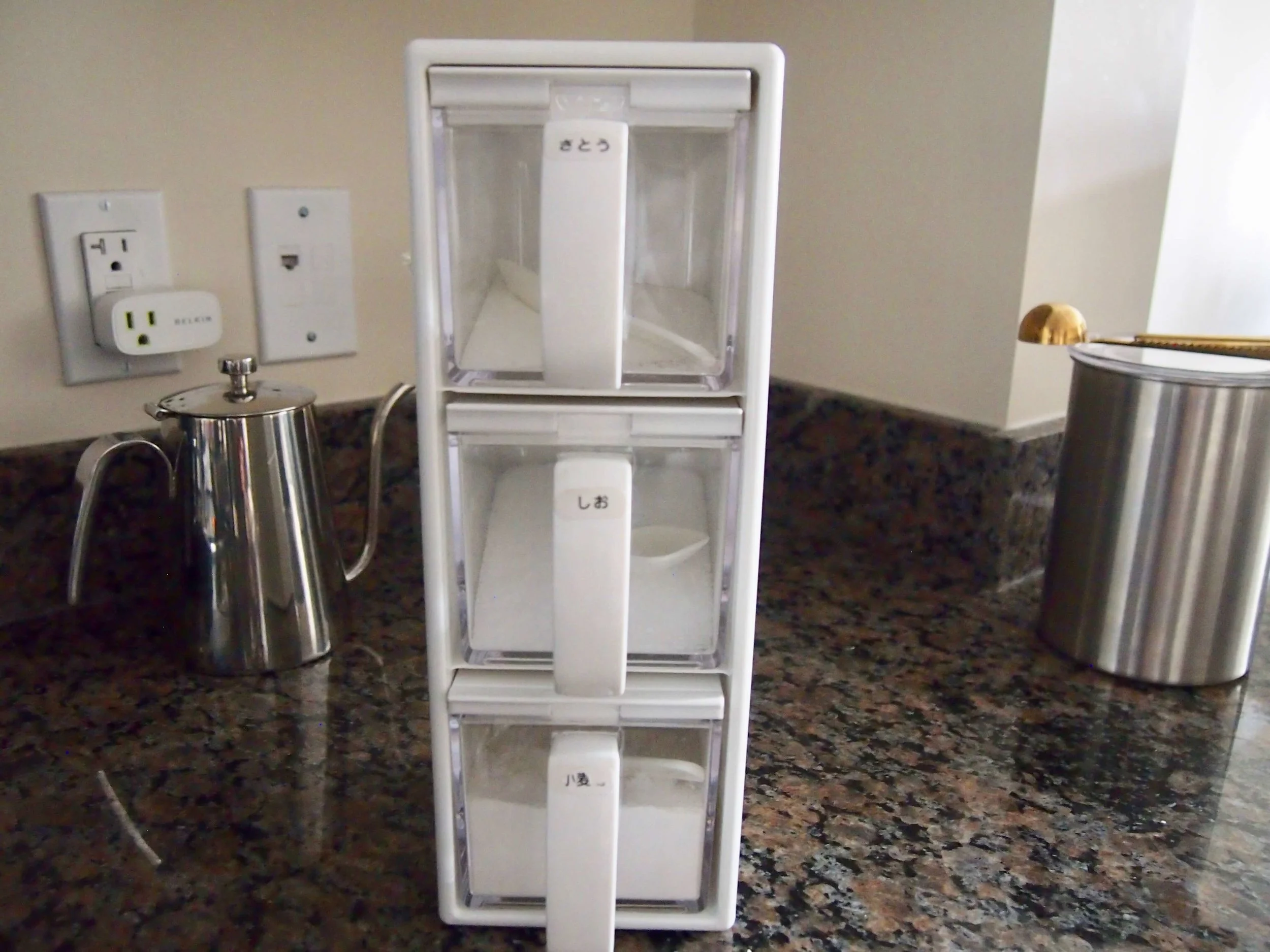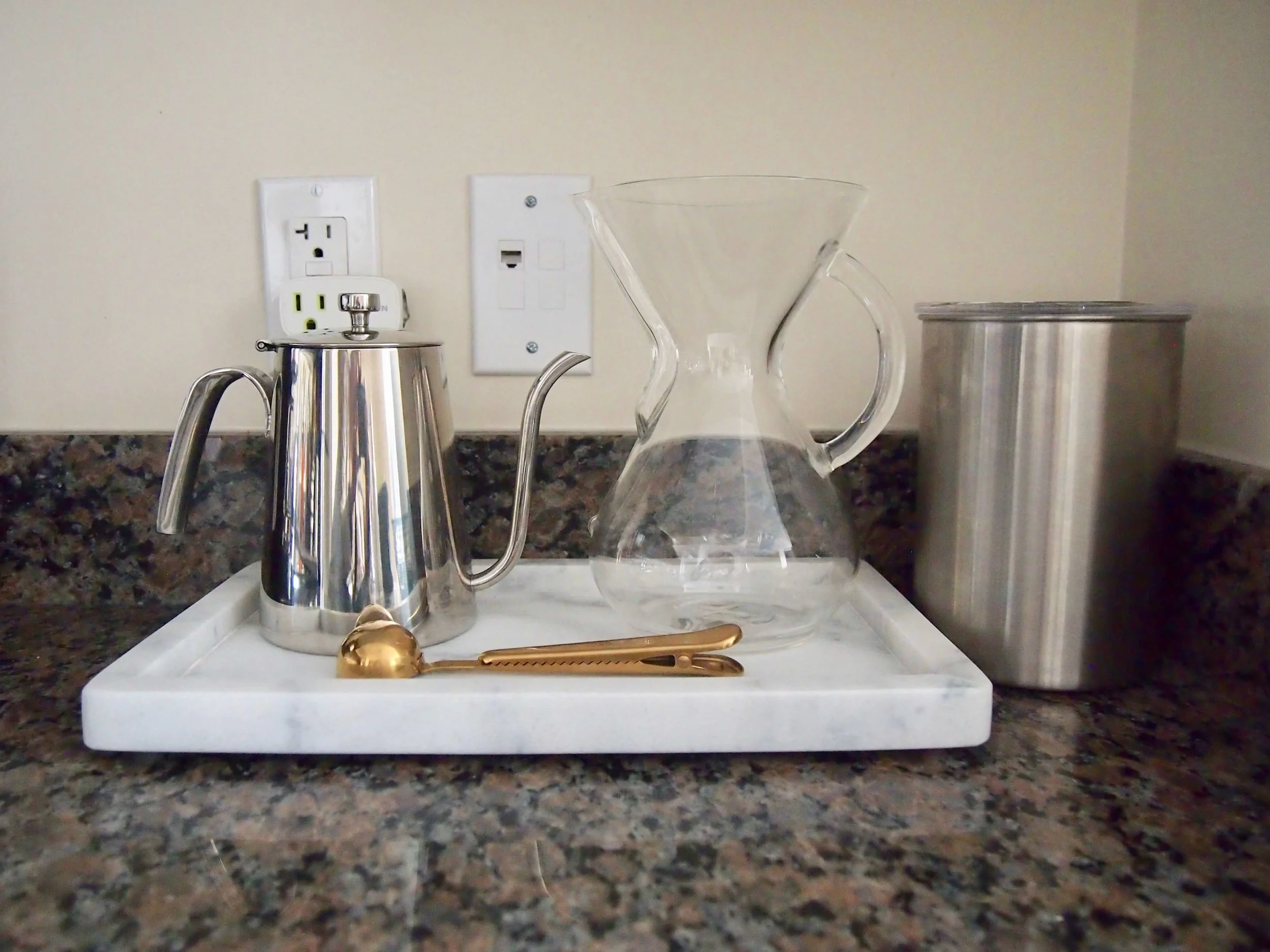 ここにはコーヒーを作るための道具をまとめて、マーブルトレイに収納しています。