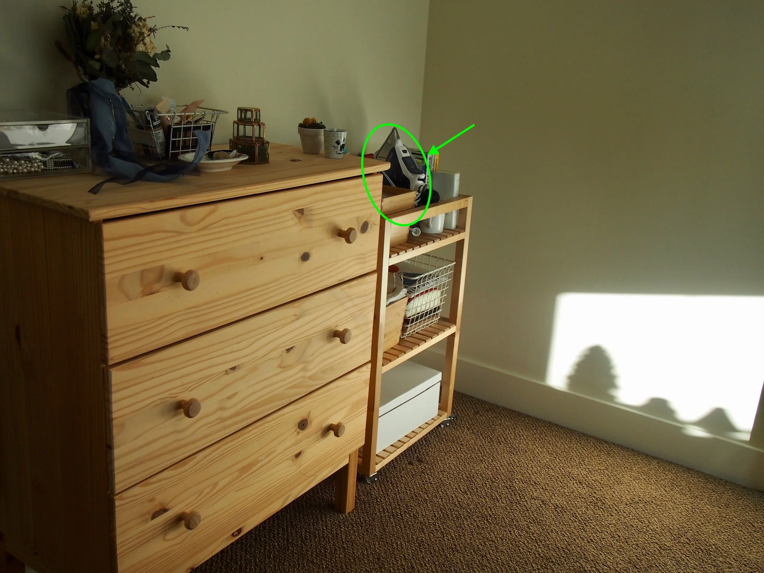 ちなみに、我が家のアイロンはこの寝室のラックに置いています。