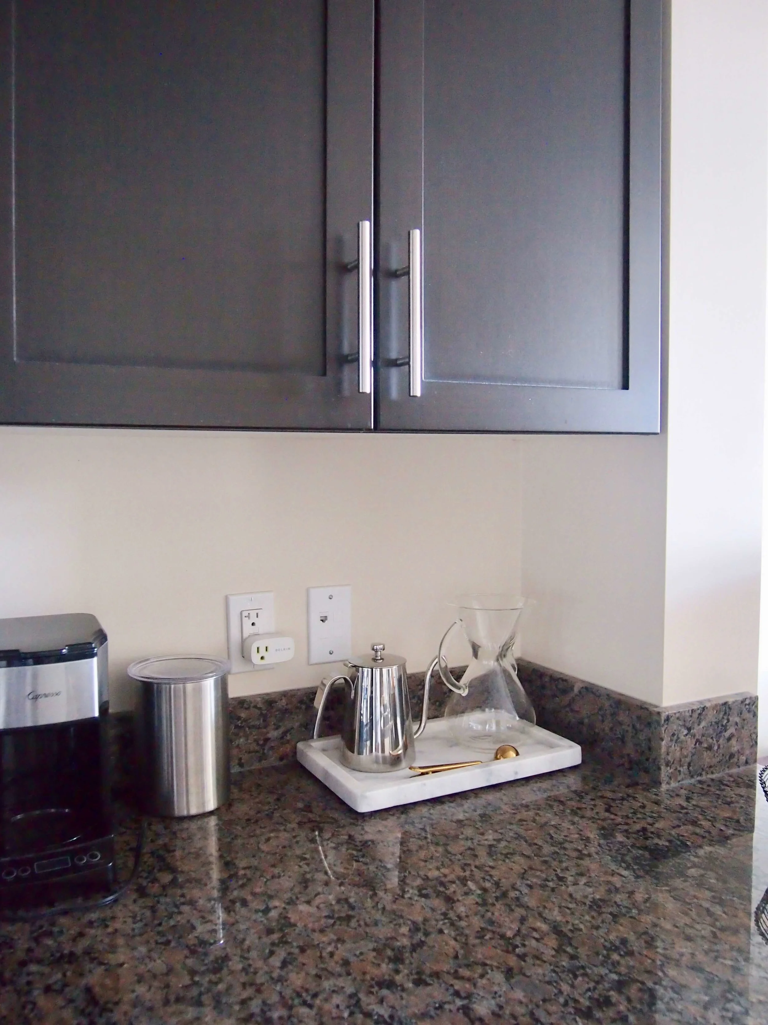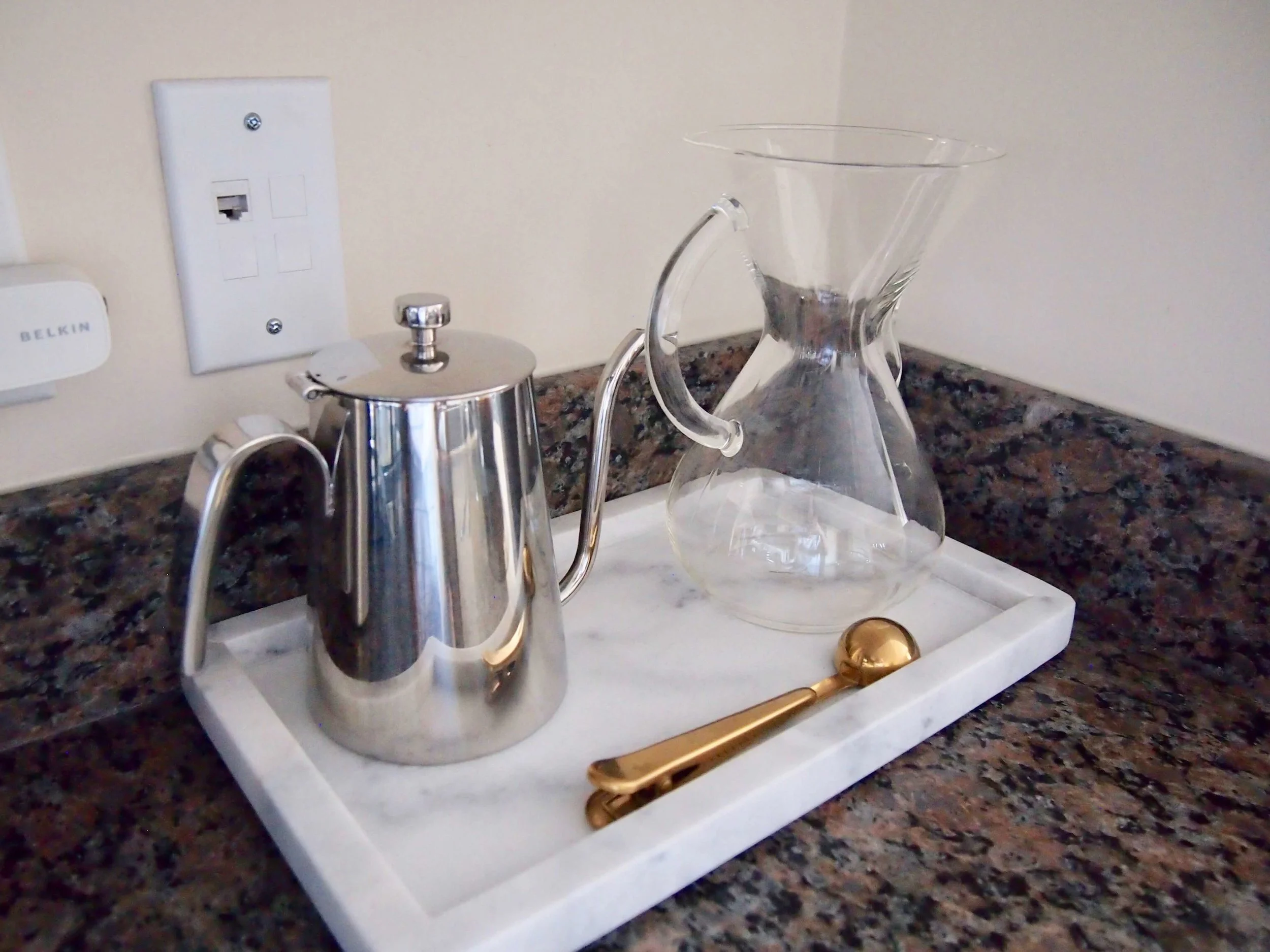 ここにはコーヒーを作るための道具をまとめて、マーブルトレイに収納しています。