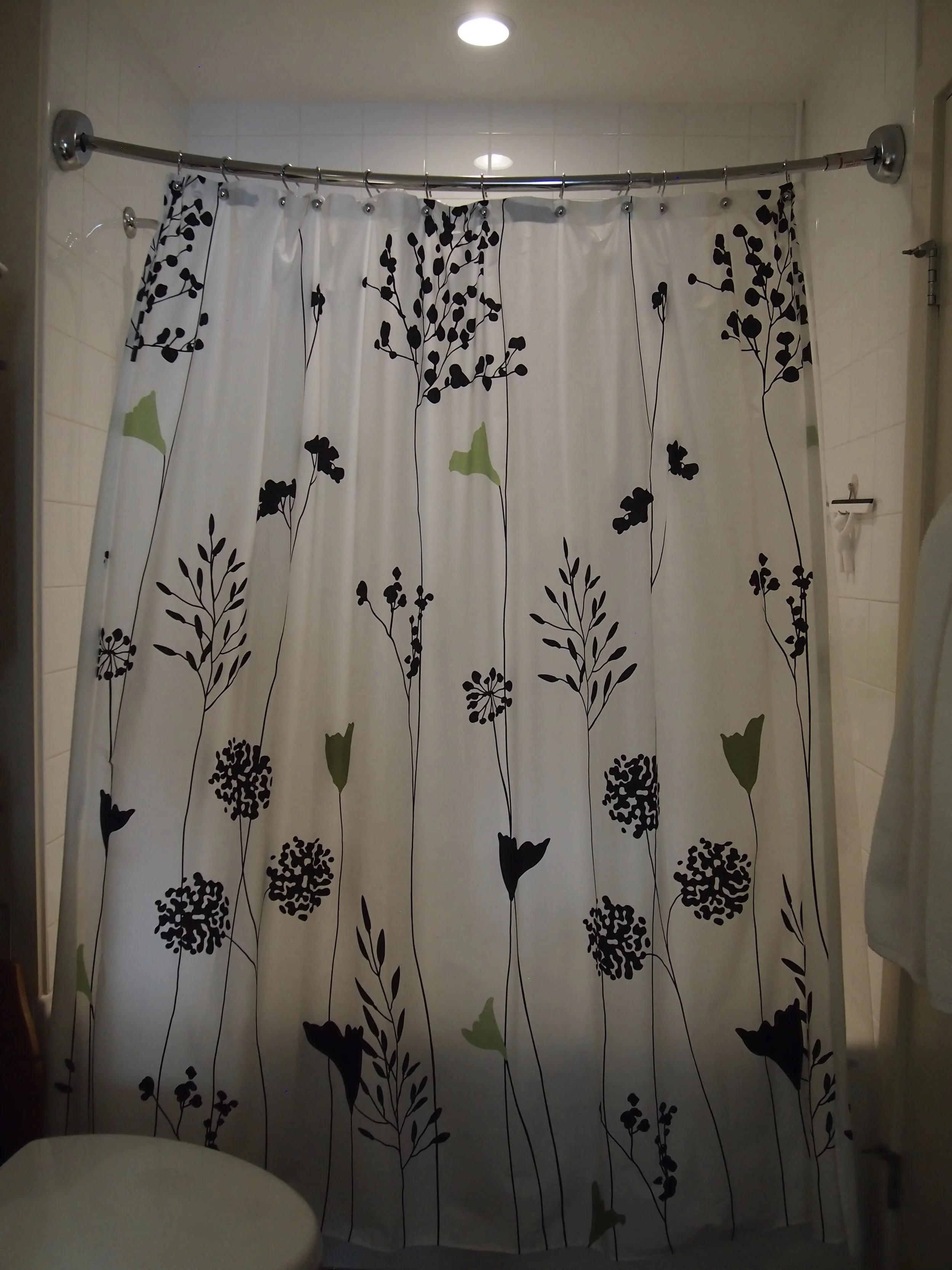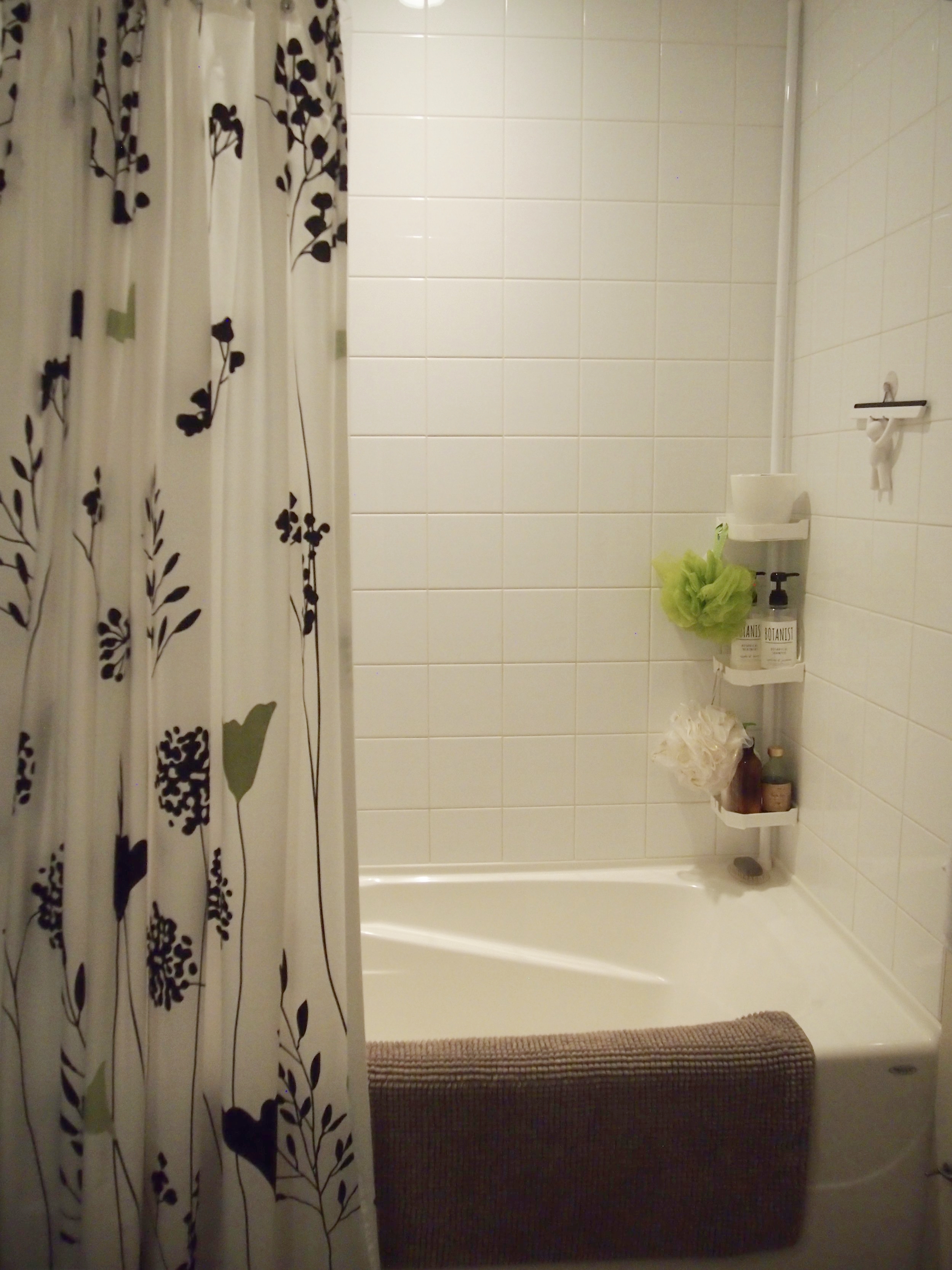 実はこのシャワーカーテンをメインにバスルームのインテリアのコーディネートを考えました。