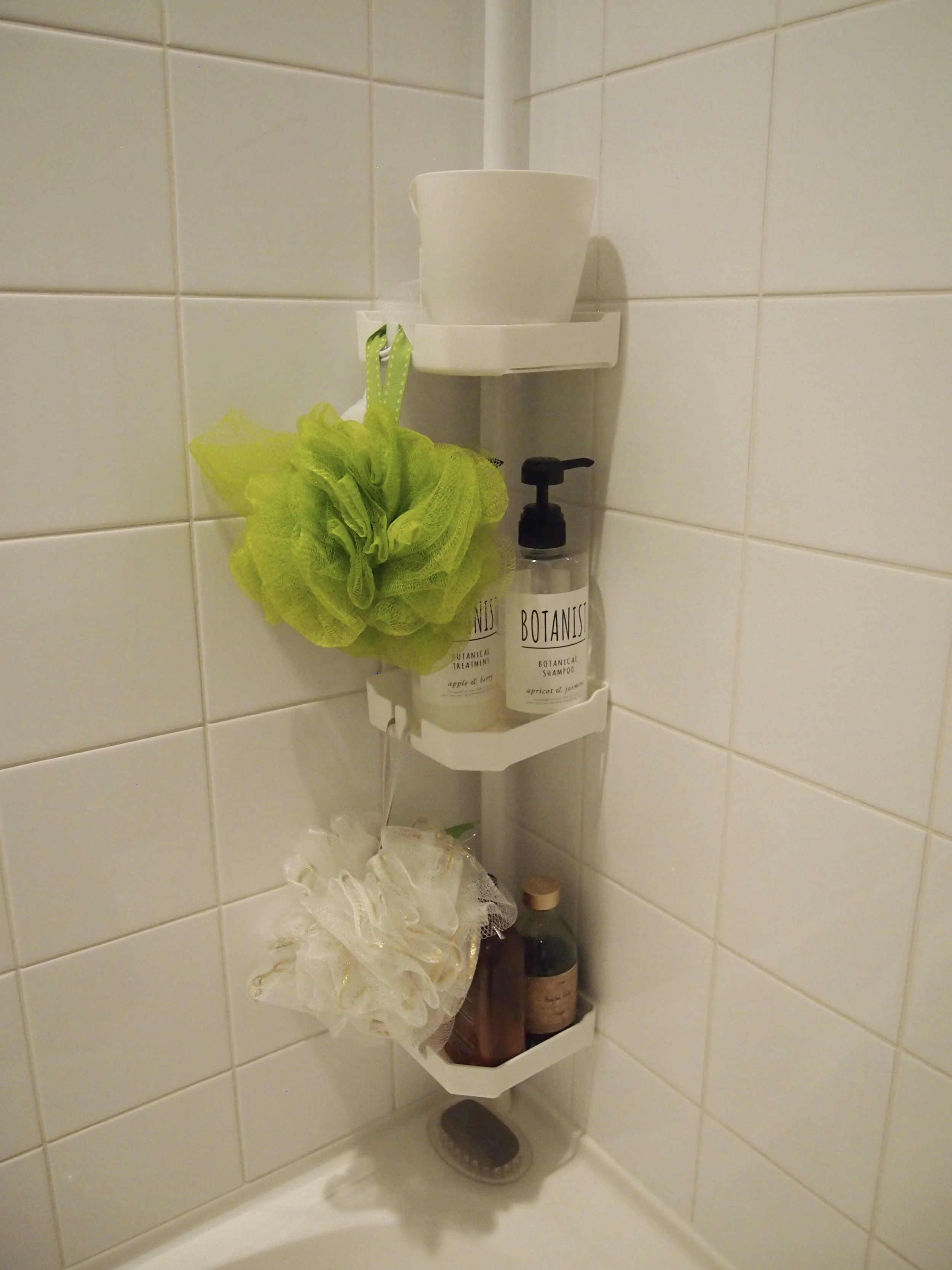 シャンプー、トリートメント、ボディーソープなどは、この突っ張り棒で支えられた収納場所に。